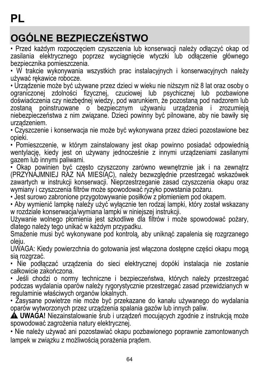 • Les enfants ne doivent pas jouer avec l’appareil. • Le nettoyage et l’entretien par l’usager ne doivent pas être effectués par des enfants sans surveillance. • La pièce doit avoir une aération suffisante lorsque la hotte est utilisée conjointement avec d'autres appareils fonctionnant au gaz ou autres combustibles. • La hotte doit être régulièrement nettoyée à la fois à l'intérieur et à l'extérieur (AU MOINS UNE FOIS PAR MOIS); cela devrait se faire en conformité avec les instructions d'entretien. Le non respect des instructions expressément fournies concernant le nettoyage de la hotte et des filtres peut provoquer des risques d'incendie. • Ne pas flamber d’aliments sous la hotte. • Pour le remplacement de la lampe, utilisez uniquement le type de lampe spécifié dans la section remplacement/maintenance lampe dans ce manuel. L'utilisation d'une flamme nue est dommageable pour les filtres et peut causer un incendie, par conséquent, il est déconseillé de l'utiliser. La friture doit être faite avec soin afin de s’assurer que l’huile surchauffée ne prenne pas feu. AVERTISSEMENT: Lorsque la table de cuisson est en fonctionnement, les parties accessibles de la hotte peuvent devenir très chaudes. • Ne pas brancher l'appareil au réseau électrique avant que l'installation ne soit complètement terminée. • En ce qui concerne les mesures techniques et de sécurité à prendre pour l'évacuation des fumées, respectez strictement les dispositions des règlements locales. • L’air ne doit pas être envoyé dans un conduit utilisé pour évacuer les fumées d’appareils utilisant du gaz ou un autre combustible. ATTENTION ! Le défaut d'installer les vis et les dispositifs de fixation conformément à ces instructions peut entraîner des risques électriques. • Ne pas utiliser ou laisser la hotte sans les lampes correctement montées, car un éventuel risque de choc électrique est possible. • N’utilisez jamais la hotte sans la grille montée correctement! • La hotte ne doit JAMAIS être utilisée comme une surface d'appui, sauf indication expresse. • Utilisez uniquement les vis de fixation fournies avec le produit pour l'installation, ou, si 36