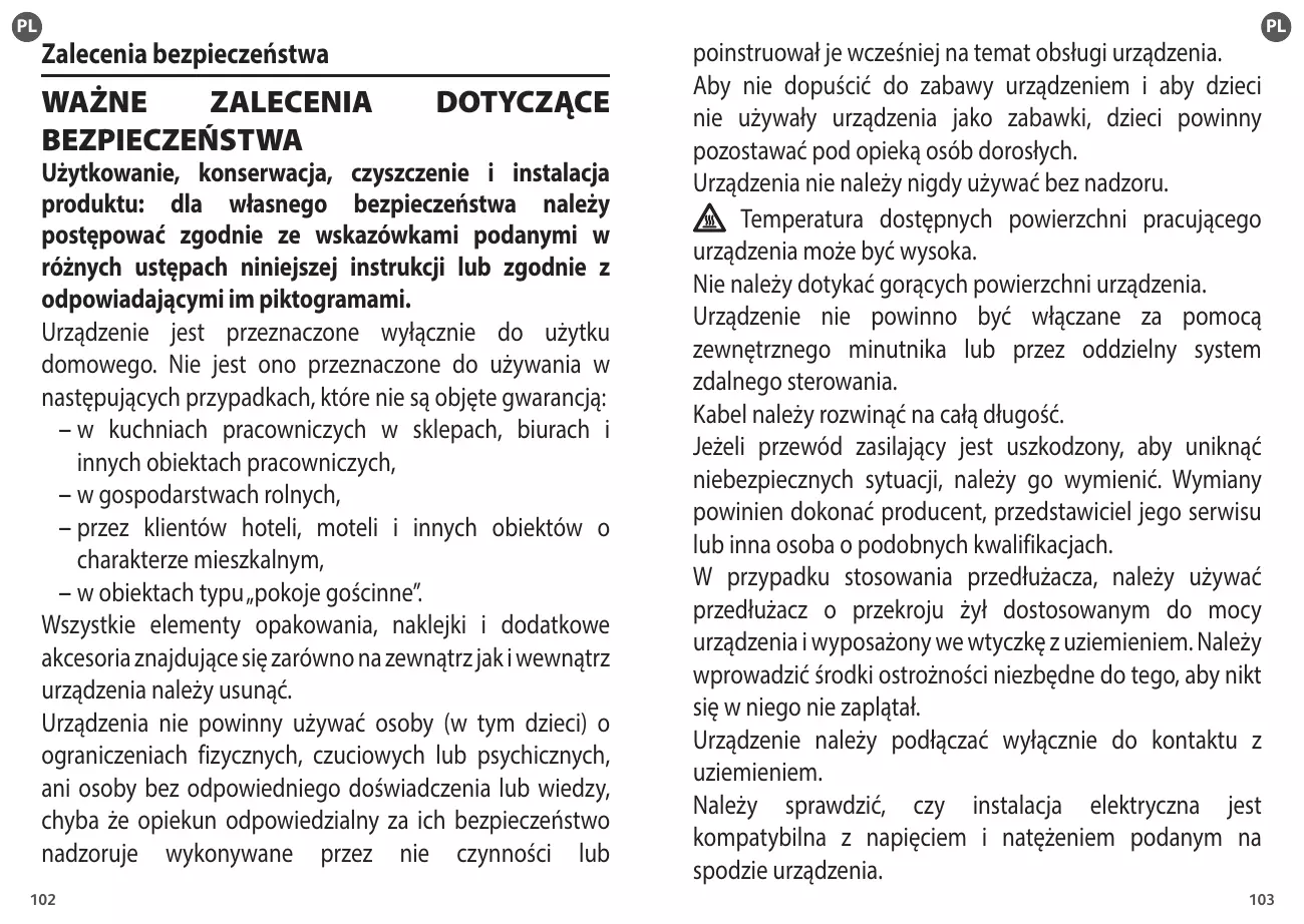 La température des surfaces accessibles peut être élevée lorsque l’appareil est en fonctionnement. Ne pas toucher les surfaces chaudes de l’appareil. Cet appareil n’est pas destiné à être mis en fonctionnement au moyen d’une minuterie extérieure ou par un système de commande à distance séparé. Dérouler entièrement le cordon. Si le câble d’alimentation est endommagé, il doit être remplacé par le fabricant, son service après-vente ou une personne de qualification similaire afin d’éviter un danger. Si une rallonge électrique est utilisée, elle doit être de section équivalente et avec prise de terre incorporée. Prendre toutes les précautions nécessaires afin que personne ne s’entrave dedans. Ne brancher l’appareil que sur une prise avec terre incorporée. Vérifier que l’installation électrique est compatible avec la puissance et la tension indiquées sous l’appareil. Cet appareil ne doit pas être immergé. Ne jamais plonger dans l’eau l’appareil ni le cordon. Cet appareil peut être utilisé par des enfants à partir de 8 ans et plus et par des personnes ayant des capacités