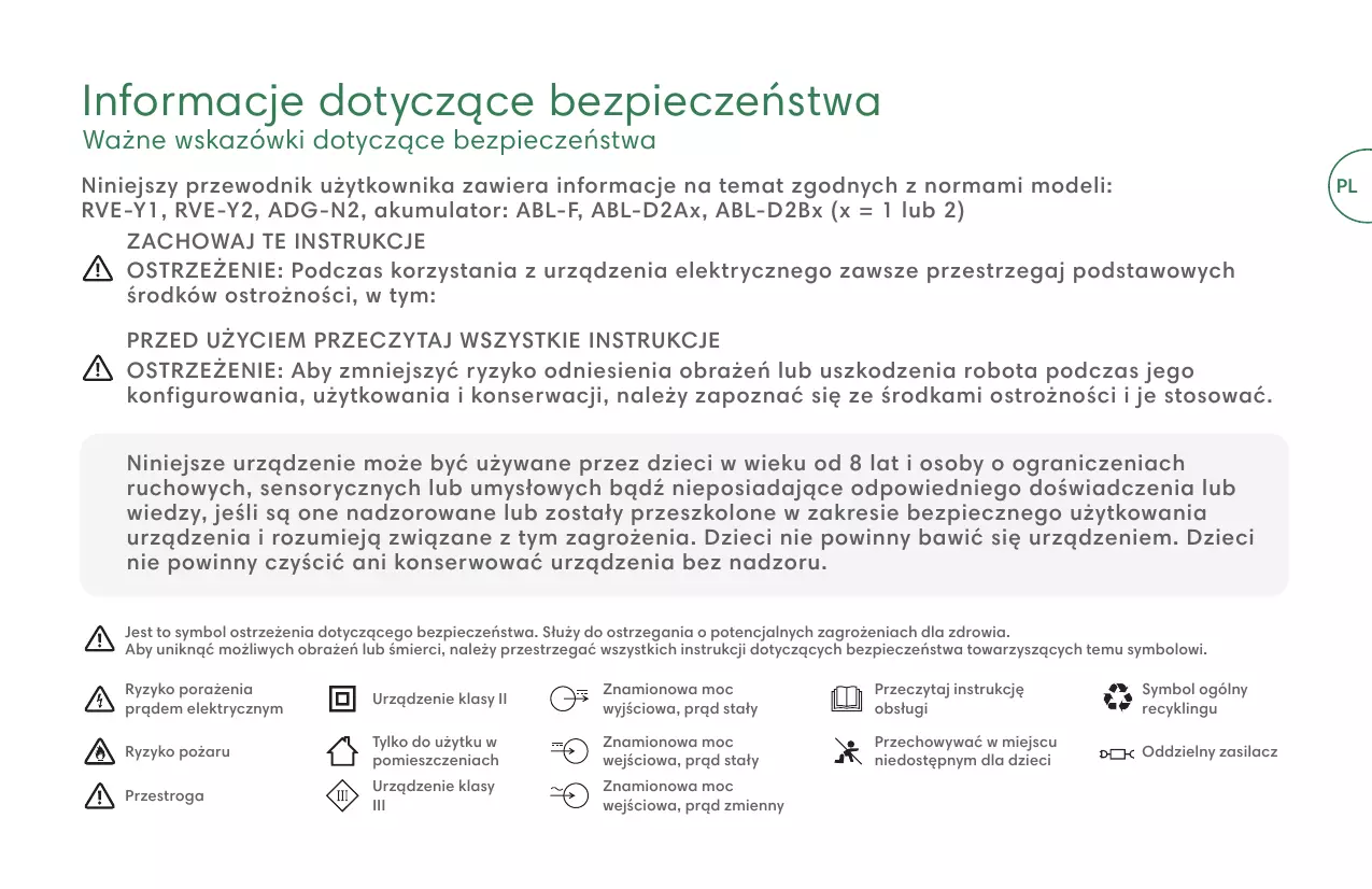 FR Ce guide du propriétaire comprend des renseignements sur les modèles de réglementation : RVE-Y1, RVE-Y2, ADG-N2, Batterie : ABL-F, ABL-D2Ax, ABL-D2Bx (x = 1 or 2) CONSERVER CES INSTRUCTIONS AVERTISSEMENT : lorsque vous utilisez un appareil électrique, vous devez respecter certaines précautions de base, notamment : LISEZ TOUTES LES INSTRUCTIONS AVERTISSEMENT: pour éviter tout risque de blessure ou de dommage, lisez et respectez les consignes de sécurité suivantes lors de la configuration, de l’utilisation et de l’entretien de votre robot. Cet appareil peut être utilisé par des enfants âgés de 8 ans et plus, et par des personnes ayant des capacités physiques, sensorielles ou mentales réduites, ou un manque d’expérience et de connaissances, si des conseils ou instructions leur ont été donnés concernant l’utilisation en toute sécurité de l’appareil et les dangers impliqués. Les enfants ne doivent pas jouer avec l’appareil. Le nettoyage et l’entretien par l’utilisateur ne doivent pas être effectués par des enfants sans surveillance. Voici le symbole d’alerte de sécurité. Il est utilisé pour vous informer d’éventuels risques de blessure. Respectez tous les messages de sécurité qui suivent ce symbole afin d’éviter tout risque de blessure ou de mort. Risque d’électrocution