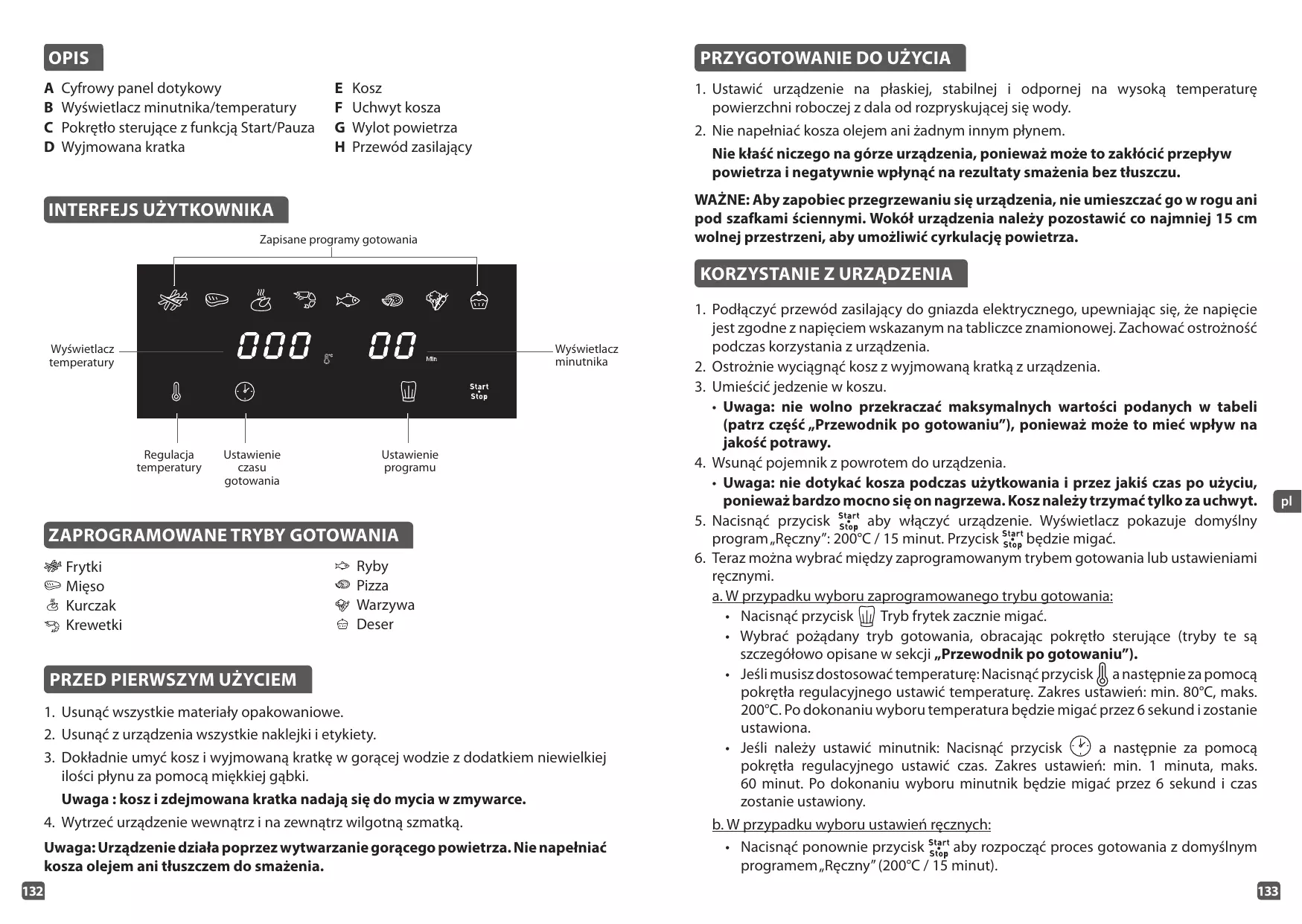 2. Retirez délicatement le tiroir de cuisson avec sa grille amovible de l’appareil. 3. Placez les aliments dans le tiroir de cuisson. • Remarque : ne dépassez jamais la quantité maximale indiquée dans le tableau (voir la section « Guide de cuisson »), car cela pourrait altérer la qualité du résultat final. 4. Replacez le tiroir de cuisson dans l’appareil. • Attention : ne touchez pas le tiroir de cuisson pendant l’utilisation et pendant un certain temps après utilisation, car il devient très chaud. Tenez le tiroir de cuisson par la poignée uniquement. 5. Appuyez sur pour allumer l’appareil. L’écran affiche le programme « Manuel » par défaut : 200°C / 15 minutes. Le bouton clignote. 6. Vous pouvez maintenant choisir entre le mode de cuisson prédéfini et le réglage manuel. a. Si vous choisissez le mode de cuisson prédéfini : • Appuyez sur le bouton Le mode Frites se met à clignoter. • Sélectionnez le mode de cuisson souhaité en tournant le bouton de contrôle (ces modes sont décrits en détail dans la section « Guide de cuisson »). • Si vous devez régler la température : appuyez sur le bouton puis utilisez le bouton de contrôle pour régler la température. Plage de contrôle : min. 80°C, max. 200°C. Une fois la sélection effectuée, la température clignote pendant 6 secondes avant d’être réglée. • S i vous devez régler le minuteur : appuyez sur le bouton puis utilisez le bouton de contrôle pour régler le temps. Plage de contrôle : min. 1 minute, max. 60 minutes. Une fois votre sélection effectuée, le minuteur clignote pendant 6 secondes avant d’être réglé. • Si vous devez régler la température : appuyez sur le bouton puis utilisez le bouton de contrôle pour régler la température. Plage de contrôle : min. 80°C, max. 200°C. Une fois la sélection effectuée, la température clignote pendant 6 secondes avant d’être réglée. • Si vous devez régler le minuteur : appuyez sur le bouton puis utilisez le bouton de contrôle pour régler le temps. Plage de contrôle : min. 1 minute, max. 60 minutes. Une fois votre sélection effectuée, le minuteur clignote pendant 6 secondes avant d’être réglé. 7. Pour revenir au programme « Manuel » par défaut, appuyez simplement de nouveau sur le bouton . 8. Validez le mode de cuisson en appuyant sur le bouton Cela lance votre cuisson. La cuisson se met en route. Le temps de cuisson restant s’affiche à l’écran. 9. Certains aliments nécessiteront d’être brassés en milieu de cuisson pour un résultat de cuisson optimal (voir la section « Guide de cuisson »). Pour brasser les aliments, appuyez sur le centre du bouton de contrôle ou sur le bouton pour interrompre la cuisson. Retirez le tiroir de cuisson hors de l’appareil par la poignée et secouez-le. Replacez le tiroir de cuisson dans l’appareil, puis appuyez de nouveau sur le centre du bouton de contrôle ou sur le bouton pour reprendre la cuisson. • Astuce : vous pouvez régler le minuteur sur la moitié du temps de cuisson. Lorsque le minuteur retentit, brassez les ingrédients. Réglez ensuite à nouveau le minuteur sur le temps de cuisson restant. • Remarque : lorsque le tiroir de cuisson est retiré, l’appareil passe en mode Pause. Pour que la cuisson reprenne, le tiroir de cuisson doit être replacé dans l’appareil dans les 10 minutes. Si le tiroir de cuisson n’est pas replacé dans l’appareil dans les 10 minutes, le programme, la température et la durée doivent être reconfigurés. • Avertissement : s’il y a beaucoup d’aliments dans le tiroir de cuisson, celui-ci peut être lourd. Lorsque vous secouez le tiroir de cuisson, utilisez vos deux mains et un gant de cuisine pour éviter de vous brûler. 10. Lorsque le minuteur retentit, le temps de cuisson configuré est terminé. Retirez le tiroir de cuisson de l’appareil et posez-le sur une surface résistante à la chaleur. 11. Vérifiez que vos aliments sont prêts. Si vos aliments ne sont pas prêts, replacez simplement le tiroir de cuisson dans l’appareil et réglez le minuteur pour ajouter quelques minutes de cuisson supplémentaires. 12. Lorsque les aliments sont cuits, utilisez une pince non métallique (par exemple, une pince en silicone) pour retirer les aliments du tiroir de cuisson. L’excès d’huile de la nourriture est recueilli dans le fond du tiroir de cuisson. • Attention : ne retournez jamais le tiroir de cuisson, car la grille amovible et l’huile chaude pourraient tomber.
