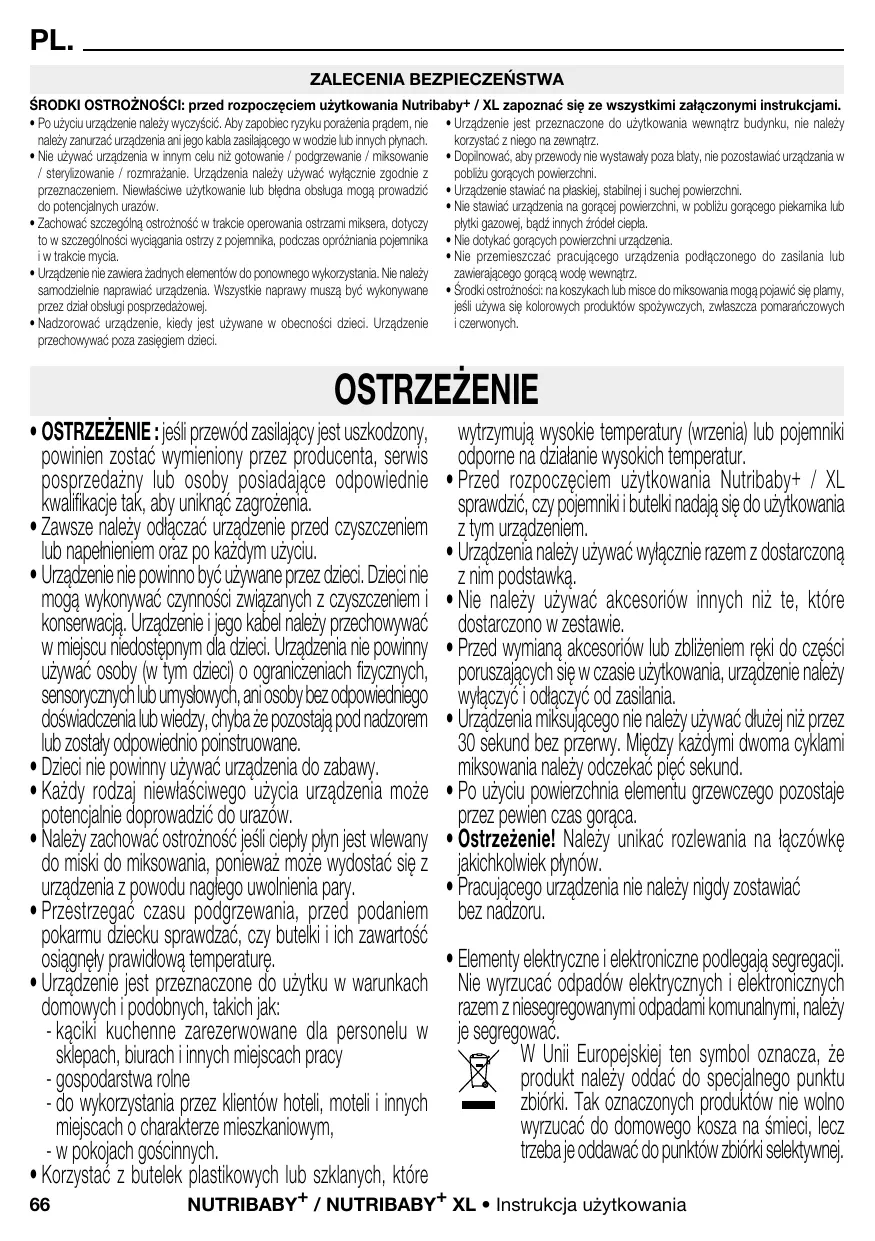 - d es environnements du type de chambres d’hôtes. • Utilisez des biberons en plastique ou en verre pouvant bouillir ou tous autres récipients thermorésistants avec cet appareil. • Vérifiez toujours vos ustensiles avant de les employer avec le Nutribaby+ / XL. • L 'appareil doit seulement être utilisé avec la base fournie. • N e pas utiliser d'accessoires autres que ceux fournis. • Éteignez l'appareil et déconnectez le câble avant de changer des accessoires ou d'approcher des pièces en mouvement pendant l'utilisation. • Ne faites pas fonctionner l'unité de mixage en continu pendant plus de 30 secondes. Attendez cinq secondes entre chaque cycle de mixage. • La surface de l'élément chauffant est soumise à la chaleur résiduelle après utilisation. • A vertissement! Évitez les déversements sur le connecteur. • Ne laissez jamais l'appareil sans surveillance pendant son fonctionnement. • Les équipements électriques et électroniques font l’objet d’une collecte sélective. Ne pas se débarrasser des déchets d’équipements électriques et électroniques avec les déchets municipaux non triés, mais procéder à leur collecte sélective. Ce symbole indique à travers l’Union Européenne que ce produit ne doit pas être jeté à la poubelle ou mélangé aux ordures ménagères, mais faire l’objet d’une collecte sélective.