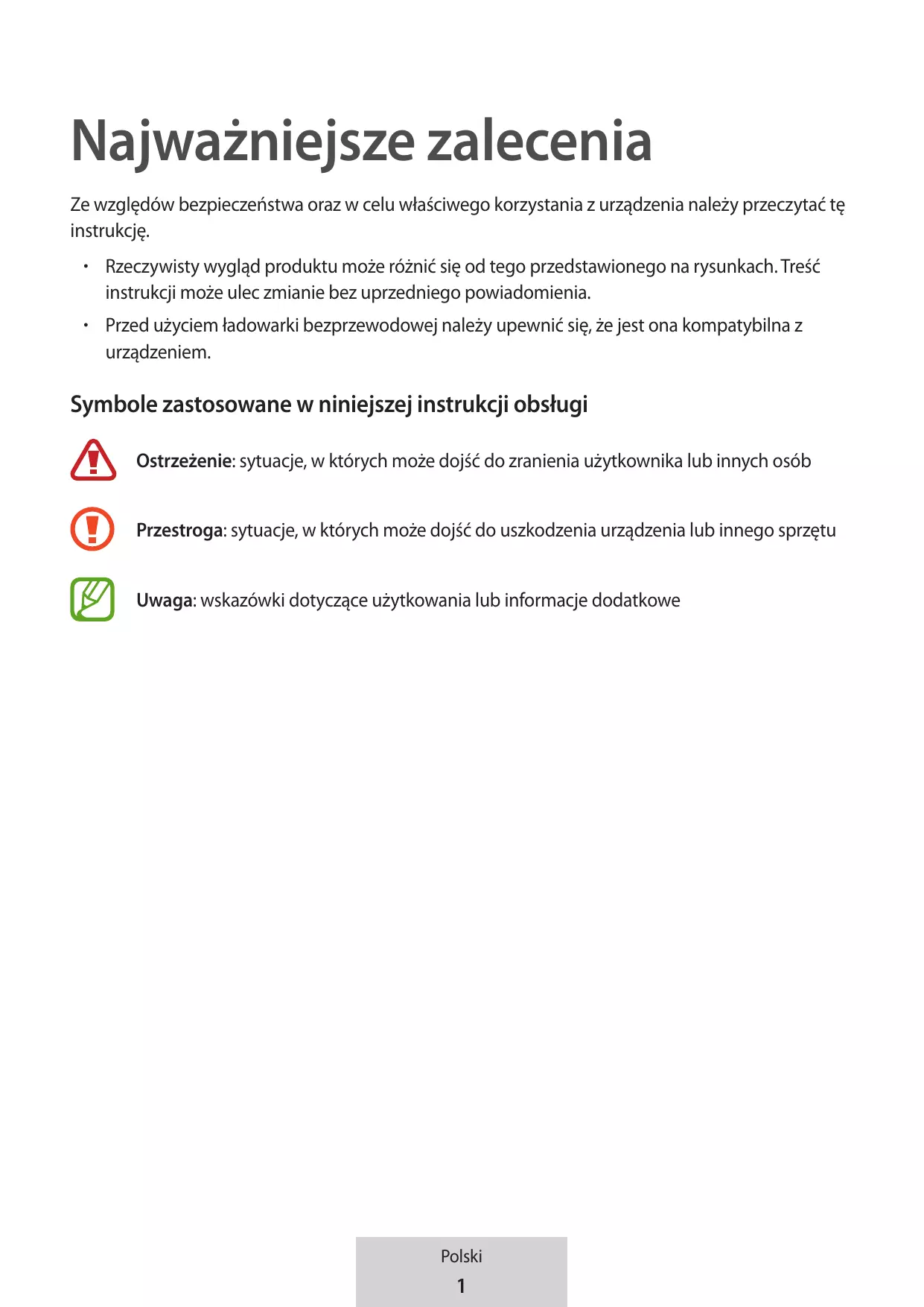 Najważniejsze zalecenia Ze względów bezpieczeństwa oraz w celu właściwego korzystania z urządzenia należy przeczytać tę instrukcję. • Rzeczywisty wygląd produktu może różnić się od tego przedstawionego na rysunkach. Treść instrukcji może ulec zmianie bez uprzedniego powiadomienia. • Przed użyciem ładowarki bezprzewodowej należy upewnić się, że jest ona kompatybilna z urządzeniem.