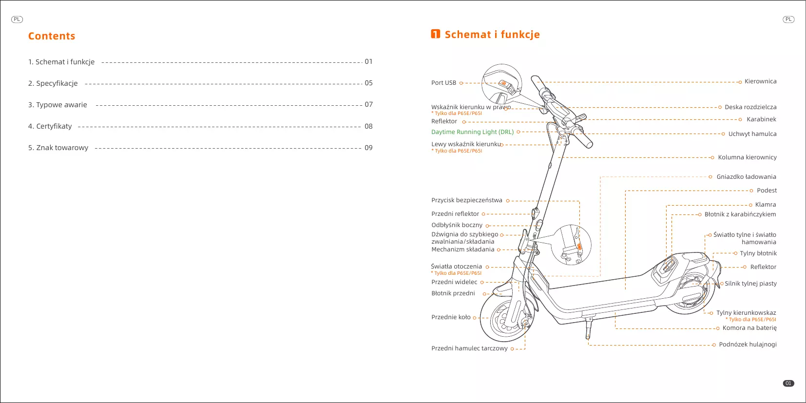 * Tylko dla P65E/P65I Kolumna kierownicy Gniazdko ładowania Podest