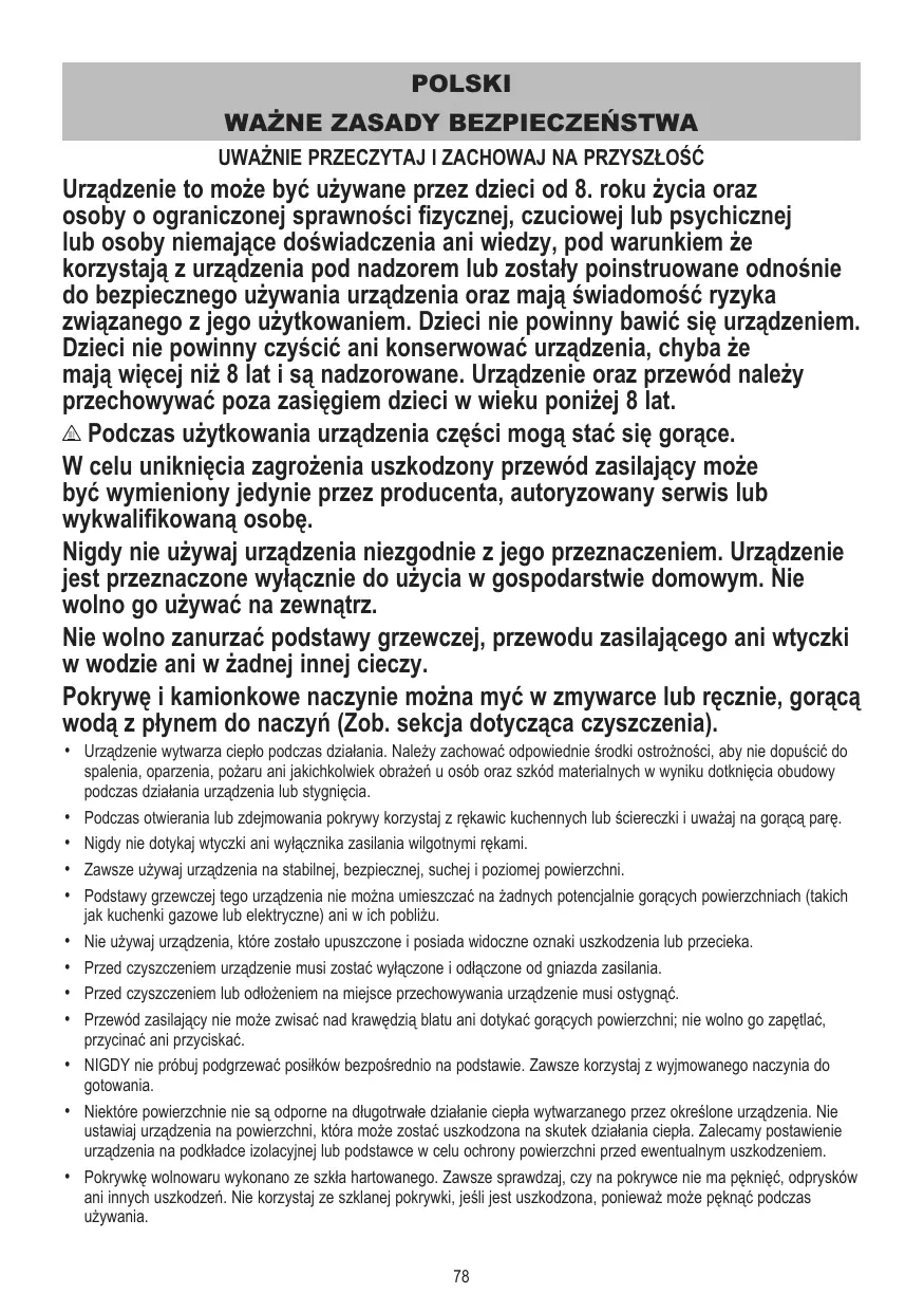 Urządzenie to może być używane przez dzieci od 8. roku życia oraz osoby o ograniczonej sprawności fizycznej, czuciowej lub psychicznej lub osoby niemające doświadczenia ani wiedzy, pod warunkiem że korzystają z urządzenia pod nadzorem lub zostały poinstruowane odnośnie do bezpiecznego używania urządzenia oraz mają świadomość ryzyka związanego z jego użytkowaniem. Dzieci nie powinny bawić się urządzeniem. Dzieci nie powinny czyścić ani konserwować urządzenia, chyba że mają więcej niż 8 lat i są nadzorowane. Urządzenie oraz przewód należy przechowywać poza zasięgiem dzieci w wieku poniżej 8 lat. Podczas użytkowania urządzenia części mogą stać się gorące. W celu uniknięcia zagrożenia uszkodzony przewód zasilający może być wymieniony jedynie przez producenta, autoryzowany serwis lub wykwalifikowaną osobę. Nigdy nie używaj urządzenia niezgodnie z jego przeznaczeniem. Urządzenie jest przeznaczone wyłącznie do użycia w gospodarstwie domowym. Nie wolno go używać na zewnątrz. Nie wolno zanurzać podstawy grzewczej, przewodu zasilającego ani wtyczki w wodzie ani w żadnej innej cieczy. Pokrywę i kamionkowe naczynie można myć w zmywarce lub ręcznie, gorącą wodą z płynem do naczyń (Zob. sekcja dotycząca czyszczenia). • Urządzenie wytwarza ciepło podczas działania. Należy zachować odpowiednie środki ostrożności, aby nie dopuścić do • • • • • • • • • • •