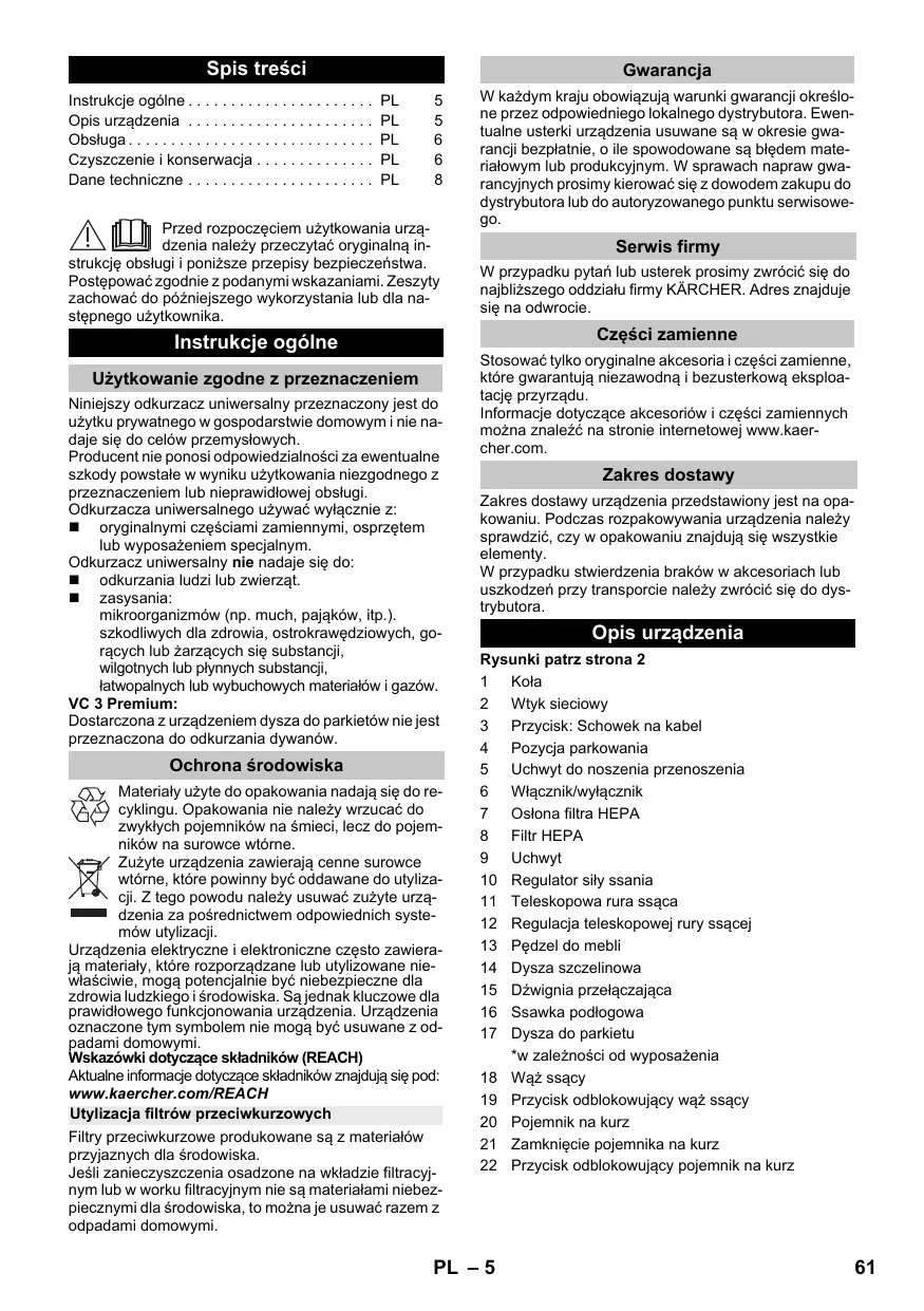 VCS - Odkurzacz z wężem KARCHER - Bezpłatna instrukcja obsługi