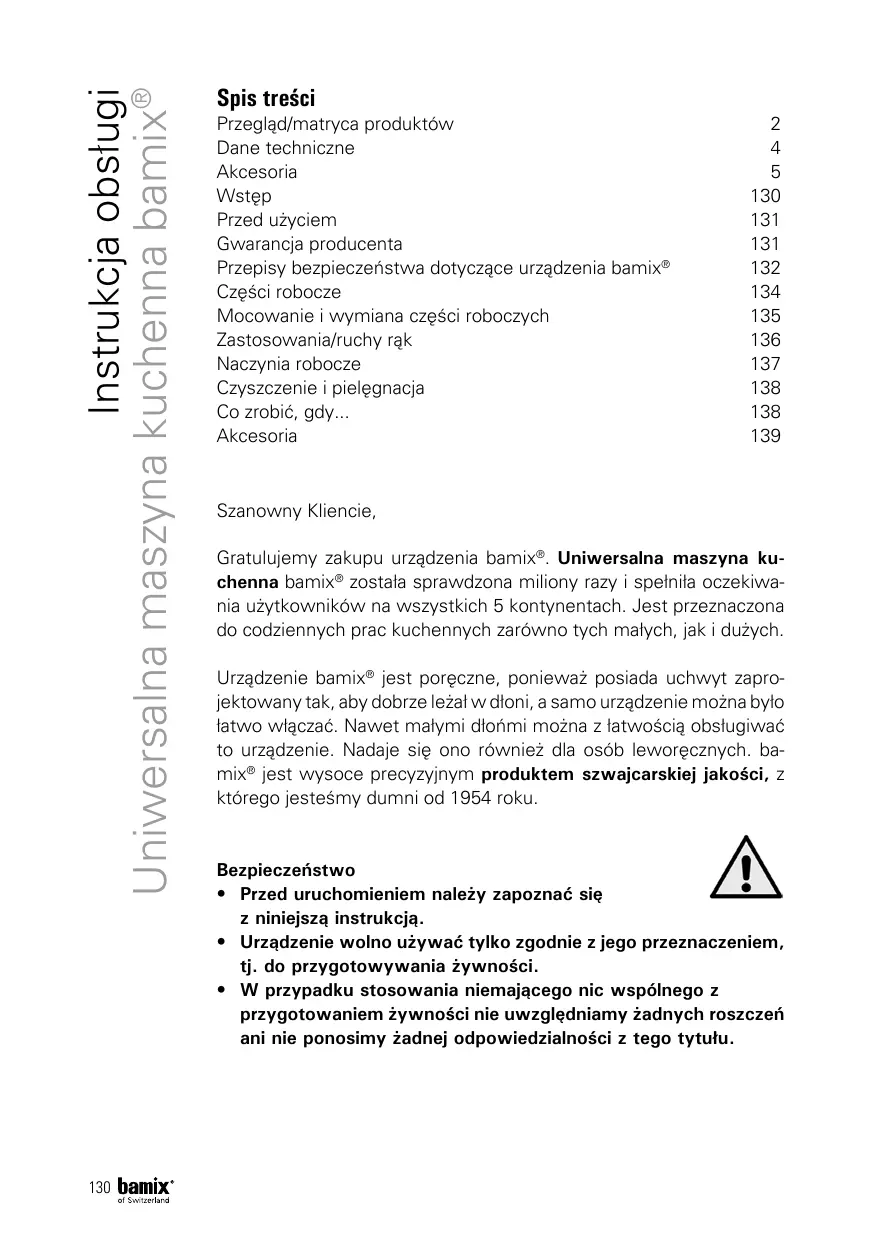 • Lorsque l‘appareil est laissé sans surveillance ou avant son installation, son démontage ou son nettoyage, il faut toujours le débrancher • Ne pas poser l’appareil sur des surfaces chaudes ou à proximité de flammes de gaz, pour éviter que le boîtier ne fonde • L’appareil ne doit être plongé dans un liquide que jusqu’au-dessous de la séparation de la poignée et du boîtier • L’appareil et le capot de protection ne doivent pas être nettoyés dans un lave-vaisselle • Nettoyer l’appareil seulement avec un chiffon humide • Retirez la prise secteur lorsque vous manipulez la coupole de protection ou les accessoires pour nettoyer l’appareil sous l’eau courante ou pour changer un accessoire • N’enclenchez l’appareil qu’après avoir plongé le tube dans le récipient de travail • Le bamix® est doté d’un interrupteur de sécurité prévenant toute mise en service intempestive, et qui arrête instantanément l’appareil dès qu’il est relâché • Si le cable de cet appareil est endommagée, elle devra être remplacée par le fabricant ou son service après-vente ou par une personne possédant des qualifications équivalentes pour éviter tout danger • Débrancher la prise secteur en cas de dérangement lors de l‘utilisation et après l’utilisation • Ne retirez jamais la fiche secteur hors de la prise lorsque vous avez les mains mouillées • Ne porter ni ne tirer jamais l’appareil par son cordon • Le cordon secteur ne doit pas reposer sur des arêtes tranchantes ni être pincé • Evitez de placer le cordon sur des objets chauds ou à proximité de flammes de gaz, et protégez-le de la chaleur et de l’huile • Ne mettez jamais l’appareil en service quand: – l’appareil, son boîtier ou son cordon secteur sont endommagés, – au moindre soupçon de défaut après une chute ou autre circonstance similaire. Dans ce cas, confier l’appareil à notre service de réparation •
