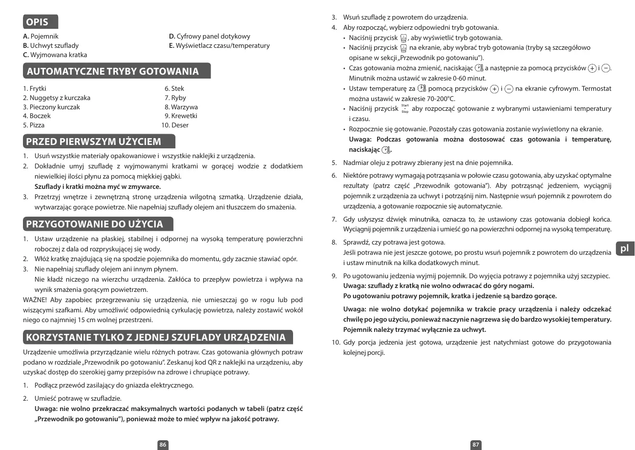 MODE D’EMPLOI DE L’APPAREIL L’appareil permet de cuire une vaste gamme de recettes. Les temps de cuisson pour les principaux ingrédients sont indiqués dans la section « Réglages ». Savourez des plats sains et croustillants grâce à notre grande variété de recettes en flashant le code QR sur le sticker du produit.