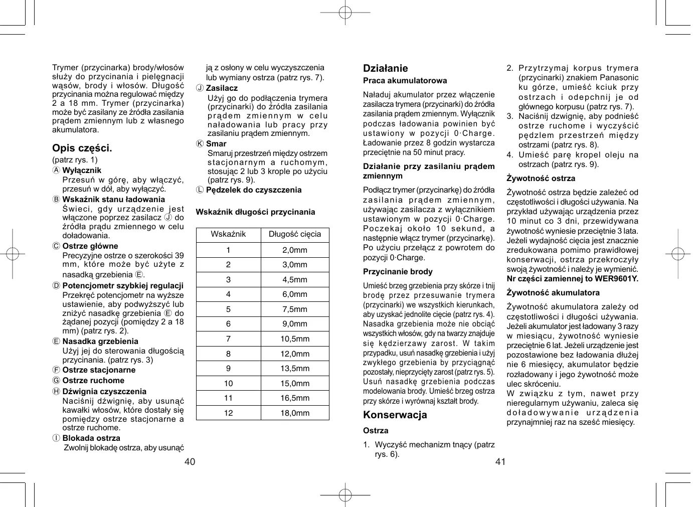ĩywotnoĞü ostrza bĊdzie zaleĪeü od czĊstotliwoĞci i dáugoĞci uĪywania. Na przykáad uĪywając urządzenia przez 0 minut co 3 dni, przewidywana ĪywotnoĞü wyniesie przeciĊtnie 3 lata. JeĪeli wydajnoĞü ciĊcia jest znacznie zredukowana pomimo prawidáowej konserwacji, ostrza przekroczyáy swoją ĪywotnoĞü i naleĪy je wymieniü. Nr czĊĞci zamiennej to WER960Y.