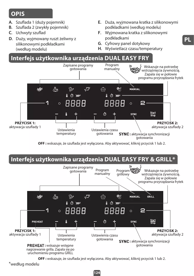 La fonction gril s’utilise uniquement pour la cuve n°1. 1. Placez toujours la plaque gril dans la cuve n° 1 de l’appareil. 2. Appuyez sur . Le mode Frites s’affiche par défaut à l’écran pour la cuve n°1 tandis que OFF s’affiche sur l’écran de la cuve n°2. 3. Appuyez sur la touche de l’écran pour sélectionner le programme Grill et ajustez le temps de cuisson si nécessaire. La température est automatiquement réglée à 200°C. Ne placez pas les aliments dans la cuve n° 1, une phase de préchauffage du gril sera lancée automatiquement. 4. Appuyez sur ‘2’ pour activer la cuve n°2 et sélectionnez le mode de cuisson souhaité (exemple : frites) et ajustez le temps et la température si nécessaire. 5. Ajoutez vos aliments dans La cuve n°2. Remettez la cuve dans l’appareil. 6. Appuyez sur . 7. Démarrez la cuisson en appuyant sur . Ceci lancera la phase de préchauffage du gril (cuve n° 1). s’allume et l’écran affiche “Pre Heat”. La température du gril est automatiquement réglée à 200°C. 8. Lorsque vous entendez la minuterie, la phase de préchauffage est terminée. L’écran affiche ‘Add’. 9. Retirez la cuve n°1 de l’appareil et posez-la sur une surface résistante à la chaleur. Attention: La cuve et la grille sont chaudes. Utilisez une pince pour mettre les ingrédients sur la grille. Note : Lorsque l’écran affiche ‘Add’ et s’il n’y a aucune action pendant 10 minutes, le programme s’arrête et l’écran affiche à nouveau “START/STOP”. Vous devrez resélectionner pour recommencer la cuisson. 10. Ajoutez les ingrédients dans la cuve et remettez-la dans l’appareil. 11. La cuisson commence automatiquement. Le temps de cuisson restant s’affiche sur l’écran. Remarque : il est nécessaire de retourner les pièces de viande à mi-cuisson. L’excès d’huile des ingrédients est collecté au fond de la cuve. 12. Lorsque le temps de cuisson est écoulé, l’appareil sonne et s’arrête. Retirez la cuve de l’appareil et posez-la sur une surface résistante à la chaleur. 13. Utilisez une pince pour retirer les ingrédients. Attention: Après la cuisson à air chaud, la cuve, la grille et les ingrédients sont chauds. Note : Pendant la cuisson, si vous retirez l’une des cuves et que vous ne la remettez pas en place dans les 5 minutes qui suivent, l’écran de cette cuve affichera ‘OFF’. L’autre cuve continue à fonctionner, mais cela met fin au programme ‘SYNC’. *selon modèle 14