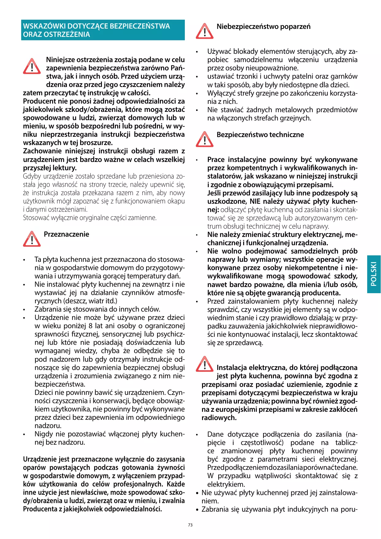 Toujours contrôler la cuisson en cas d’emploi de graisses et huiles, car elles peuvent s’enflammer rapidement. Réchauffer les graisses et les huiles au maximum pendant une minute et n’utiliser jamais la fonction Booster. Faire attention à ne pas se brûler pendant et après l’emploi du dispositif. S’assurer qu’aucun câble électrique fixe ou mobile du dispositif n’entre en contact avec le verre ou une poêle chaude. Ne pas utiliser le plan de cuisson pour réchauffer les boîtes. N’appliquer aucun type de couverture au plan induction. Les câbles électriques ne doivent pas être en contact avec le plan de cuisson. Il est conseillé de protéger les mains de la chaleur en utilisant des gants de cuisine. N’utiliser que de gants de cuisine secs. Utiliser exclusivement des casseroles et des poêles lisses et magnétiques, adaptées aux plaques à induction. Éviter que sucre, matériels synthétiques ou films d’aluminium entrent en contact avec les zones chaudes. Ces substances, pendant le refroidissement, peuvent provoquer des fissures ou d’autres altérations sur la surface vitrocéramique : éteindre le dispositif et enlever immédiatement de la zone de cuisson encore chaude Soulever toujours les casseroles pour ne pas rayer la surface de la plaque de cuisson. Casseroles et plan de cuisson doivent être parfaitement nettoyés avant d’entrer en contact. Ne pas faire tomber d'objets sur la plaque de cuisson !
