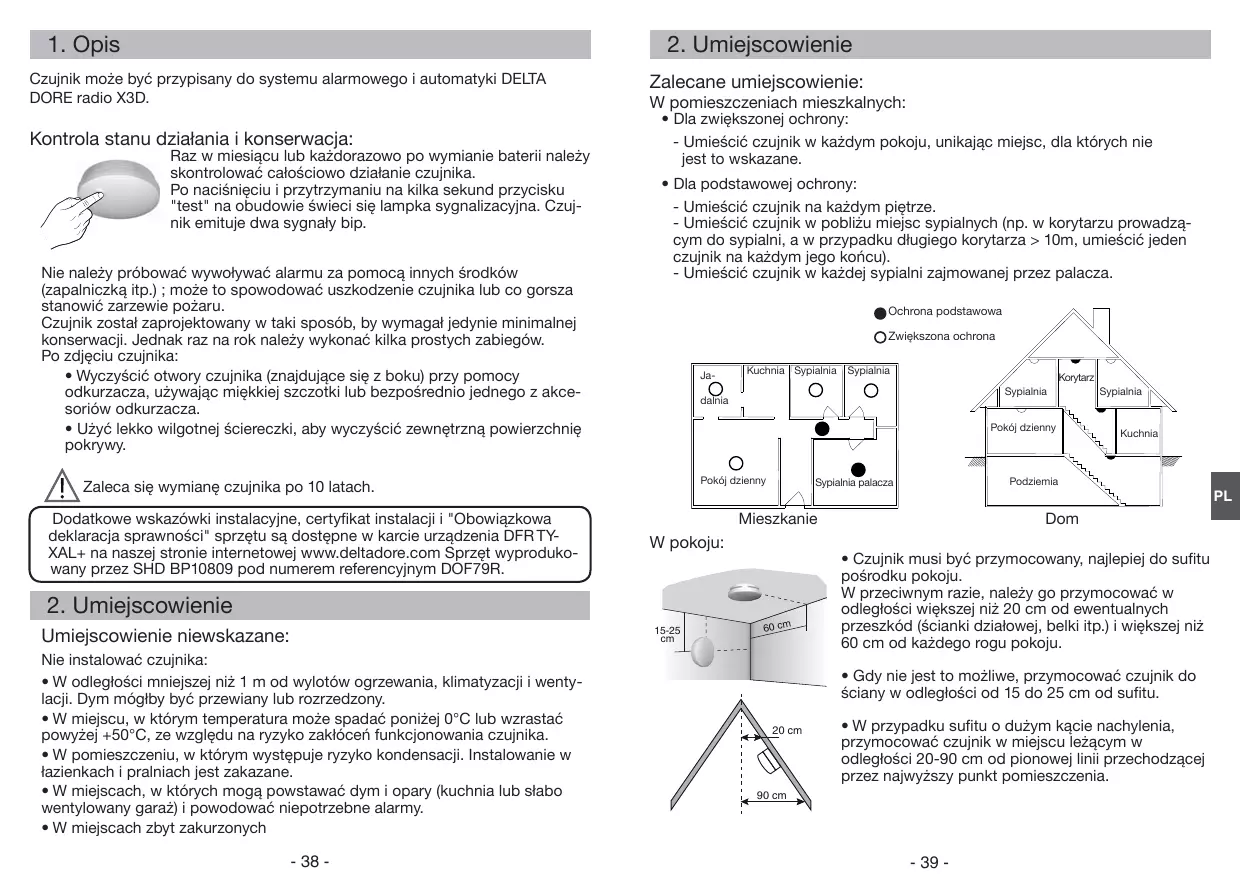 Czujnik mo¿e byæ przypisany do systemu alarmowego i automatyki DELTA DORE radio X3D. Kontrola stanu dzia³ania i konserwacja: Raz w miesi¹cu lub ka¿dorazowo po wymianie baterii nale¿y skontrolowaæ ca³ościowo dzia³anie czujnika. Po naciśniêciu i przytrzymaniu na kilka sekund przycisku "test" na obudowie świeci siê lampka sygnalizacyjna. Czujnik emituje dwa sygna³y bip. Nie nale¿y próbowaæ wywo³ywaæ alarmu za pomoc¹ innych środków (zapalniczk¹ itp.) ; mo¿e to spowodowaæ uszkodzenie czujnika lub co gorsza stanowiæ zarzewie po¿aru. Czujnik zosta³ zaprojektowany w taki sposób, by wymaga³ jedynie minimalnej konserwacji. Jednak raz na rok nale¿y wykonaæ kilka prostych zabiegów. Po zdjêciu czujnika: