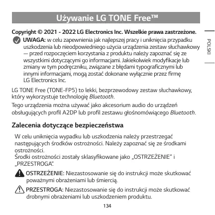 POLSKI Copyright © 2021 - 2022 LG Electronics Inc. Wszelkie prawa zastrzeżone. UWAGA: w celu zapewnienia jak najlepszej pracy i uniknięcia przypadku uszkodzenia lub nieodpowiedniego użycia urządzenia zestaw słuchawkowy — przed rozpoczęciem korzystania z produktu należy zapoznać się ze wszystkimi dotyczącymi go informacjami. Jakiekolwiek modyfikacje lub zmiany w tym podręczniku, związane z błędami typograficznymi lub innymi informacjami, mogą zostać dokonane wyłącznie przez firmę LG Electronics Inc.