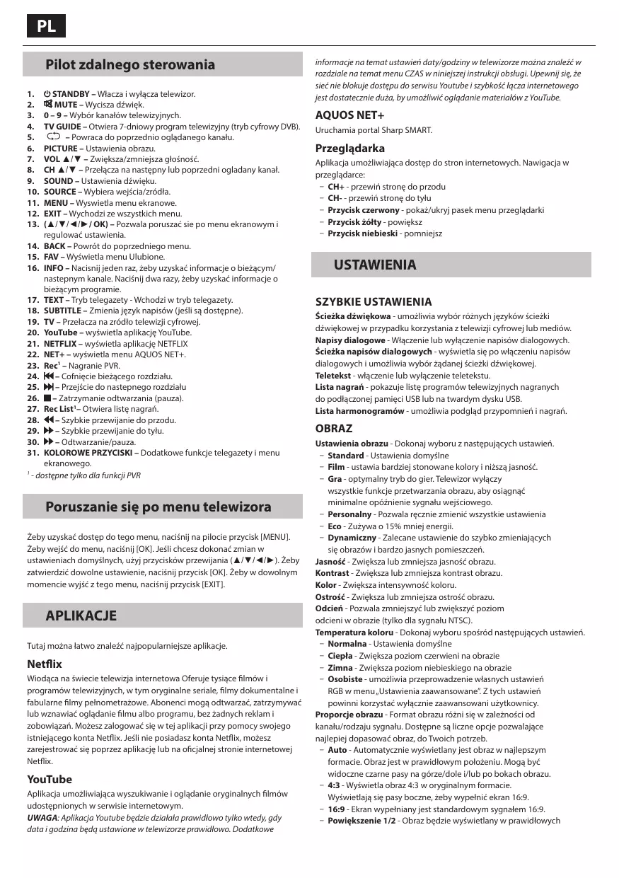 ekranowego. - dostępne tylko dla funkcji PVR Poruszanie się po menu telewizora Żeby uzyskać dostęp do tego menu, naciśnij na pilocie przycisk [MENU]. Żeby wejść do menu, naciśnij [OK]. Jeśli chcesz dokonać zmian w ustawieniach domyślnych, użyj przycisków przewijania (▲/▼/◄/►). Żeby zatwierdzić dowolne ustawienie, naciśnij przycisk [OK]. Żeby w dowolnym momencie wyjść z tego menu, naciśnij przycisk [EXIT]. APLIKACJE Tutaj można łatwo znaleźć najpopularniejsze aplikacje. Netflix Wiodąca na świecie telewizja internetowa Oferuje tysiące filmów i programów telewizyjnych, w tym oryginalne seriale, filmy dokumentalne i fabularne filmy pełnometrażowe. Abonenci mogą odtwarzać, zatrzymywać lub wznawiać oglądanie filmu albo programu, bez żadnych reklam i zobowiązań. Możesz zalogować się w tej aplikacji przy pomocy swojego istniejącego konta Netflix. Jeśli nie posiadasz konta Netflix, możesz zarejestrować się poprzez aplikację lub na oficjalnej stronie internetowej Netflix. YouTube Aplikacja umożliwiająca wyszukiwanie i oglądanie oryginalnych filmów udostępnionych w serwisie internetowym. UWAGA: Aplikacja Youtube będzie działała prawidłowo tylko wtedy, gdy data i godzina będą ustawione w telewizorze prawidłowo. Dodatkowe informacje na temat ustawień daty/godziny w telewizorze można znaleźć w rozdziale na temat menu CZAS w niniejszej instrukcji obsługi. Upewnij się, że sieć nie blokuje dostępu do serwisu Youtube i szybkość łącza internetowego jest dostatecznie duża, by umożliwić oglądanie materiałów z YouTube. AQUOS NET+ Uruchamia portal Sharp SMART. Przeglądarka Aplikacja umożliwiająca dostęp do stron internetowych. Nawigacja w przeglądarce: – CH+ - przewiń stronę do przodu – CH- - przewiń stronę do tyłu – Przycisk czerwony - pokaż/ukryj pasek menu przeglądarki – Przycisk żółty - powiększ – Przycisk niebieski - pomniejsz USTAWIENIA SZYBKIE USTAWIENIA Ścieżka dźwiękowa - umożliwia wybór różnych języków ścieżki dźwiękowej w przypadku korzystania z telewizji cyfrowej lub mediów. Napisy dialogowe - Włączenie lub wyłączenie napisów dialogowych. Ścieżka napisów dialogowych - wyświetla się po włączeniu napisów dialogowych i umożliwia wybór żądanej ścieżki dźwiękowej. Teletekst - włączenie lub wyłączenie teletekstu. Lista nagrań - pokazuje listę programów telewizyjnych nagranych do podłączonej pamięci USB lub na twardym dysku USB. Lista harmonogramów - umożliwia podgląd przypomnień i nagrań. OBRAZ Ustawienia obrazu - Dokonaj wyboru z następujących ustawień. – Standard - Ustawienia domyślne – Film - ustawia bardziej stonowane kolory i niższą jasność. – Gra - optymalny tryb do gier. Telewizor wyłączy wszystkie funkcje przetwarzania obrazu, aby osiągnąć minimalne opóźnienie sygnału wejściowego. – Personalny - Pozwala ręcznie zmienić wszystkie ustawienia – Eco - Zużywa o 15% mniej energii. – Dynamiczny - Zalecane ustawienie do szybko zmieniających się obrazów i bardzo jasnych pomieszczeń. Jasność - Zwiększa lub zmniejsza jasność obrazu. Kontrast - Zwiększa lub zmniejsza kontrast obrazu. Kolor - Zwiększa intensywność koloru. Ostrość - Zwiększa lub zmniejsza ostrość obrazu. Odcień - Pozwala zmniejszyć lub zwiększyć poziom odcieni w obrazie (tylko dla sygnału NTSC). Temperatura koloru - Dokonaj wyboru spośród następujących ustawień. – Normalna - Ustawienia domyślne – Ciepła - Zwiększa poziom czerwieni na obrazie – Zimna - Zwiększa poziom niebieskiego na obrazie – Osobiste - umożliwia przeprowadzenie własnych ustawień RGB w menu „Ustawienia zaawansowane”. Z tych ustawień powinni korzystać wyłącznie zaawansowani użytkownicy. Proporcje obrazu - Format obrazu różni się w zależności od kanału/rodzaju sygnału. Dostępne są liczne opcje pozwalające najlepiej dopasować obraz, do Twoich potrzeb. – Auto - Automatycznie wyświetlany jest obraz w najlepszym formacie. Obraz jest w prawidłowym położeniu. Mogą być widoczne czarne pasy na górze/dole i/lub po bokach obrazu. – 4:3 - Wyświetla obraz 4:3 w oryginalnym formacie. Wyświetlają się pasy boczne, żeby wypełnić ekran 16:9. – 16:9 - Ekran wypełniany jest standardowym sygnałem 16:9. – Powiększenie 1/2 - Obraz będzie wyświetlany w prawidłowych