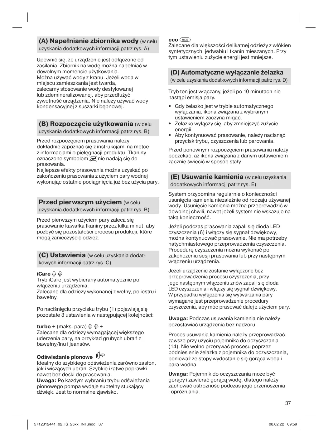 Przed ponownym Rozpoczeciem prasowania nalez y poczeka, aż ikona zwiazana z danym ustawieniem zaćnie swiecić w sposob stały.