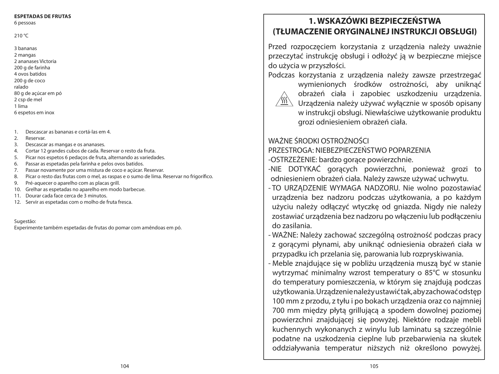Rol de spiesen vervolgens door een kokos-suikermengsel. Zet apart. Mix de rest van het fruit met de honing en met de schil en het sap van de limoen. Zet in de koelkast. 9. Verwarm het apparaat voor met de grillplaten erop bevestigd. 10. Bak de spiesen rondom op de barbecuestand. 11. Bak elke kant ongeveer 3 minuten. 12. Serveer de spiesen met de frisse fruitsaus. Suggestie: Maak ook eens fruitspiesen met boomgaardfruit en amandelmeel. - No permita que el cable de alimentación entre en contacto con ninguna fuente de calor. - Ya que las superficies exteriores pueden calentarse durante el uso del electrodoméstico, asegúrese de no permitir que dichas