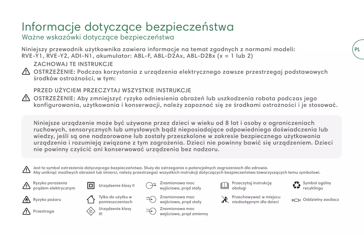 ull firmly on the wheel to remove it from P its housing (see illustration below). Remove any debris from inside the wheel cavity. FR Ce guide du propriétaire comprend des renseignements sur les modèles de réglementation : RVE-Y1, RVE-Y2, ADI-N1, Batterie : ABL-F, ABL-D2Ax, ABL-D2Bx (x = 1 or 2) CONSERVER CES INSTRUCTIONS AVERTISSEMENT : lorsque vous utilisez un appareil électrique, vous devez respecter certaines précautions de base, notamment : LISEZ TOUTES LES INSTRUCTIONS AVERTISSEMENT: pour éviter tout risque de blessure ou de dommage, lisez et respectez les consignes de sécurité suivantes lors de la configuration, de l’utilisation et de l’entretien de votre robot. Cet appareil peut être utilisé par des enfants âgés de 8 ans et plus, et par des personnes ayant des capacités physiques, sensorielles ou mentales réduites, ou un manque d’expérience et de connaissances, si des conseils ou instructions leur ont été donnés concernant l’utilisation en toute sécurité de l’appareil et les dangers impliqués. Les enfants ne doivent pas jouer avec l’appareil. Le nettoyage et l’entretien par l’utilisateur ne doivent pas être effectués par des enfants sans surveillance. Voici le symbole d’alerte de sécurité. Il est utilisé pour vous informer d’éventuels risques de blessure. Respectez tous les messages de sécurité qui suivent ce symbole afin d’éviter tout risque de blessure ou de mort. Risque d’électrocution