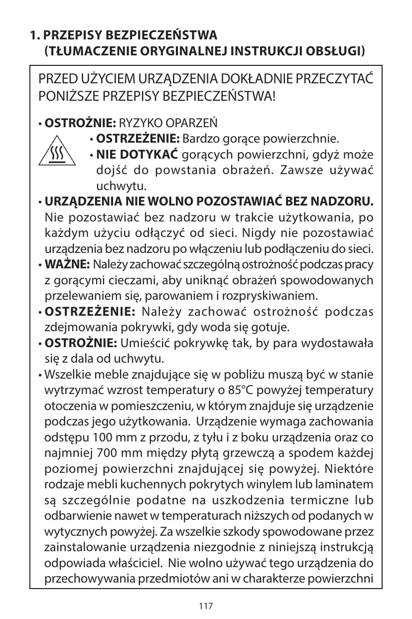 • AVERTISSEMENT : ôter le couvercle avec précaution lorsque l’eau est en ébullition. • ATTENTION : positionner le couvercle de façon à dévier la vapeur de la poignée. • Toute pièce de mobilier adjacente doit pouvoir résister à une augmentation de température d’au moins 85 °C au-dessus de la température ambiante de la pièce où se trouve l’appareil durant son utilisation. L’espace autour de l’appareil doit être dégagé de 100 mm à l’avant, à l’arrière et sur les côtés de l’appareil et de 700 mm entre la plaque de cuisson et le côté inférieur de toute surface horizontale située au-dessus de l’appareil. Certains meubles de cuisine en vinyle ou en stratifié sont particulièrement sensibles aux dommages dus à la chaleur ou aux décolorations dues à des températures élevées, même inférieures aux directives susmentionnées. Tout dommage découlant d’une installation de l’appareil 1
