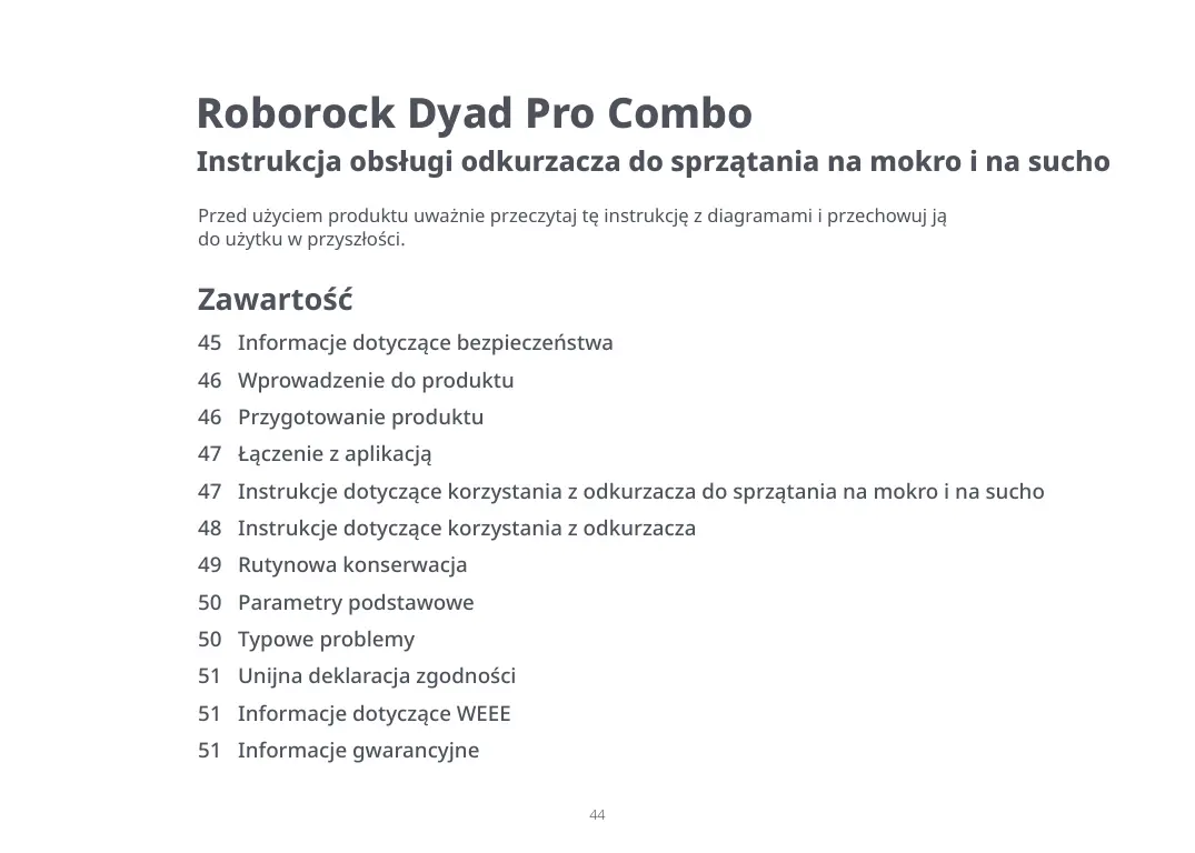 Roborock Dyad Pro Combo Instrukcja obsługi odkurzacza do sprzątania na mokro i na sucho Przed użyciem produktu uważnie przeczytaj tę instrukcję z diagramami i przechowuj ją do użytku w przyszłości. Zawartość 45 Informacje dotyczące bezpieczeństwa 46 Wprowadzenie do produktu 46 Przygotowanie produktu 47 Łączenie z aplikacją 47 Instrukcje dotyczące korzystania z odkurzacza do sprzątania na mokro i na sucho 48 Instrukcje dotyczące korzystania z odkurzacza 49 Rutynowa konserwacja 50 Parametry podstawowe 50 Typowe problemy 51 Unijna deklaracja zgodności 51 Informacje dotyczące WEEE 51 Informacje gwarancyjne