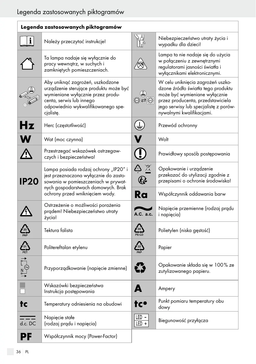 Lampa posiada rodzaj ochrony „IP20“ i jest przeznaczona wyłącznie do zastosowania w pomieszczeniach w prywatnych gospodarstwach domowych. Brak ochrony przed wniknięciem wody.