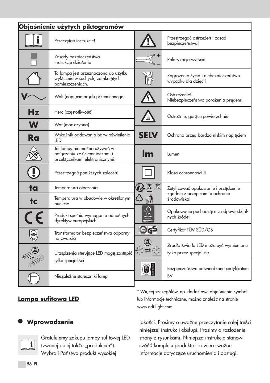 Wprowadzenie Gratulujemy zakupu lampy sufitowej LED (zwanej dalej także „produktem”). Wybrali Państwo produkt wysokiej 86 PL