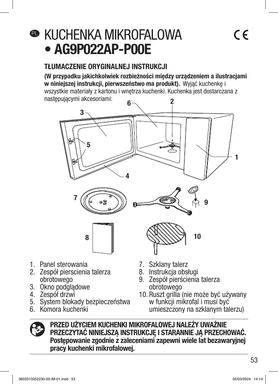 2 4. Tous les aliments et récipients doivent toujours être placés sur le plateau en verre pour la cuisson. 5. Ne jamais bloquer le mouvement du plateau tournant. 6. Si le plateau en verre ou l’ensemble de l’anneau du plateau tournant se fissure ou se casse, contactez le centre de service agréé le plus proche.