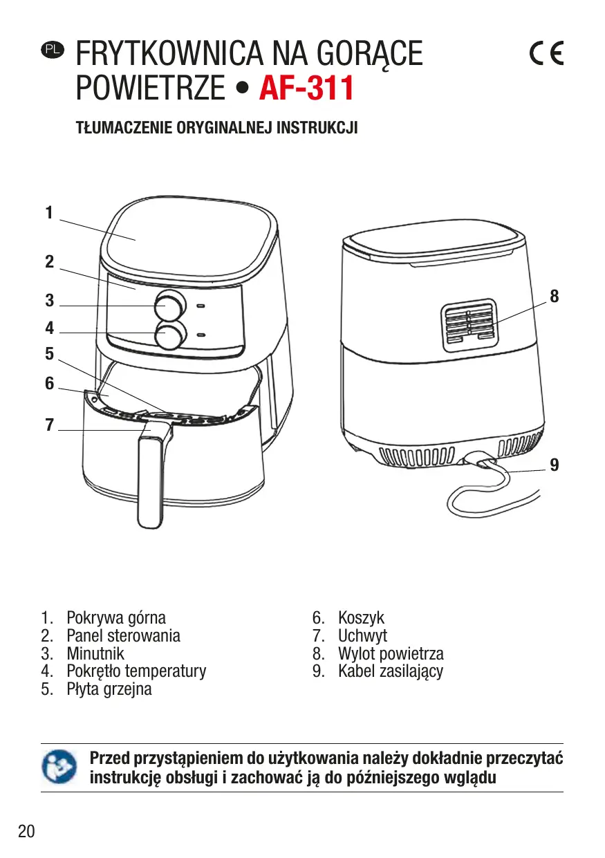Koszyk Uchwyt Wylot powietrza Kabel zasilający Przed przystąpieniem do użytkowania należy dokładnie przeczytać instrukcję obsługi i zachować ją do późniejszego wglądu