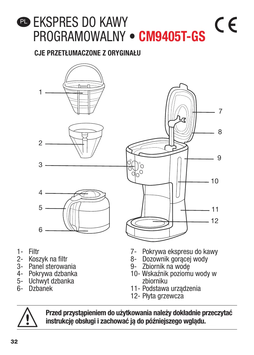 Dostępne części urządzenia mogą nagrzewać się w trakcie eksploatacji. Nie dotykać podstawy urządzenia. Nigdy nie zanurzać urządzenia i przewodu zasilającego w wodzie lub innej cieczy. Szczegółowe informacje na temat sposobu czyszczenia powierzchni mających kontakt z żywnością znajdują się w poniższym ustępie instrukcji obsługi. Przed odłączeniem od zasilania należy wyłączyć urządzenie i poczekać na całkowite ostygnięcie. Po użyciu na powierzchni grzałki może pozostawać ciepło resztkowe. Nie ustawiać ekspresu do kawy na płycie gazowej lub elektrycznej albo w jej pobliżu ani nie wstawiać urządzenia do piekarnika. Nie czyścić dzbanka za pomocą środków czyszczących, metalowych drapaków oraz innych materiałów ściernych. W celu odłączenia urządzenia od zasilania należy nacisnąć przełącznik i wyjąć wtyczkę z gniazda ściennego. Zawsze chwytać za wtyczkę. Nigdy nie ciągnąć za przewód. Zdjęcie pokrywy podczas cykli funkcjonowania może skutkować poparzeniami. Zachować ostrożność, aby nie oparzyć się parą. Niektóre części urządzenia nagrzewają się podczas użytkowania i z tego względu nie należy ich dotykać ręką. Chwytać wyłącznie za uchwyt. Nie pozostawiać pustego dzbanka na włączonej płycie grzewczej, gdyż może to spowodować jej pęknięcie. Nie stawiać gorącego dzbanka na mokrej lub zimnej powierzchni. Nie uruchamiać ekspresu do kawy bez wody. Nie używać urządzenia, jeśli dzbanek wykazuje oznaki pęknięcia lub uchwyt jest uszkodzony. Aby zmniejszyć ryzyko pożaru lub porażenia prądem, nie należy zdejmować pokrywy podczas pracy ekspresu. Żadna z części nie nadaje się do wymiany przez użytkownika. Naprawy mogą być wykonane wyłącznie przez autoryzowany serwis. Dzbanek jest przeznaczony do użytkowania z tym urządzeniem. Nie można go używać na kuchennej płycie grzewczej. Zachować ostrożność podczas posługiwania się dzbankiem, ponieważ jest bardzo delikatny. Zachować niniejsze instrukcje. Chronić przed wyciekiem na złącze. Ekspres do kawy nie powinien być umieszczony wewnątrz mebla, gdy jest używany.