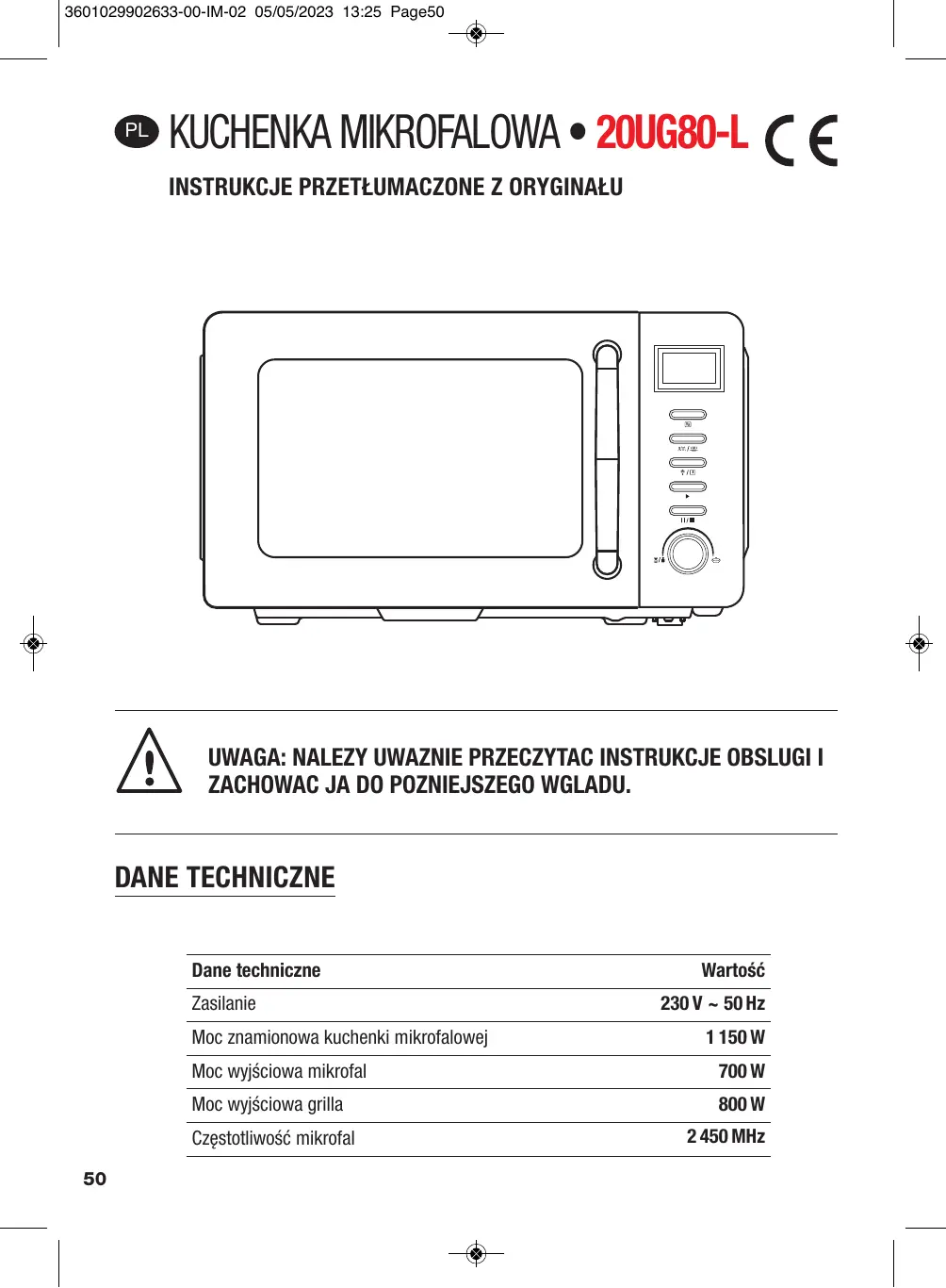 UWAGA: NALEZY UWAZNIE PRZECZYTAC INSTRUKCJE OBSLUGI I ZACHOWAC JA DO POZNIEJSZEGO WGLADU. DANE TECHNICZNE Dane techniczne Zasilanie Moc znamionowa kuchenki mikrofalowej 230 V ~ 50 Hz 1 150 W Moc wyjściowa mikrofal 700 W Moc wyjściowa grilla 800 W Częstotliwość mikrofal