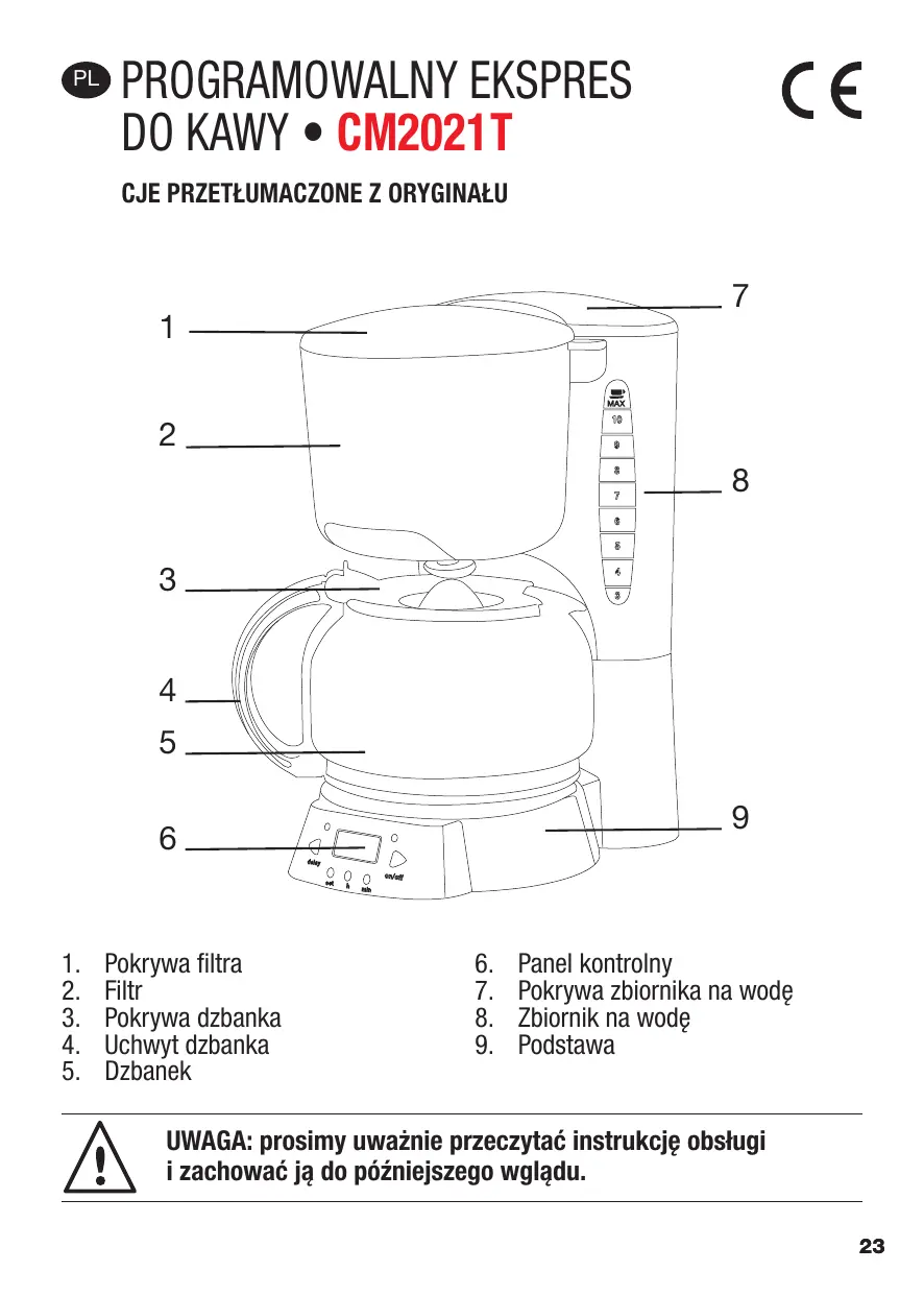 Panel kontrolny Pokrywa zbiornika na wodę Zbiornik na wodę Podstawa UWAGA: prosimy uważnie przeczytać instrukcję obsługi i zachować ją do późniejszego wglądu.