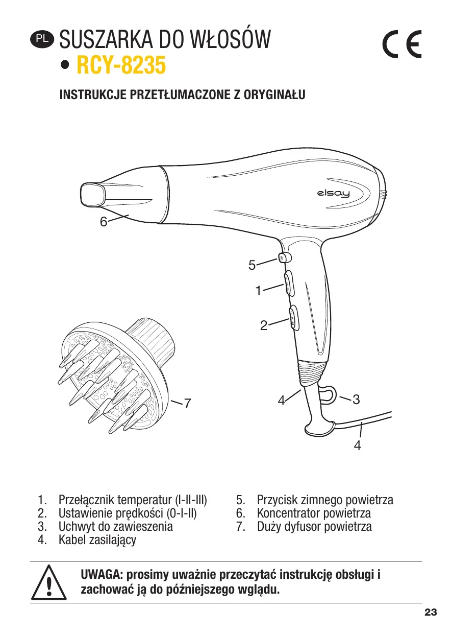 RCY-8235 - Suszarka do włosów ELSAY - Bezpłatna instrukcja obsługi