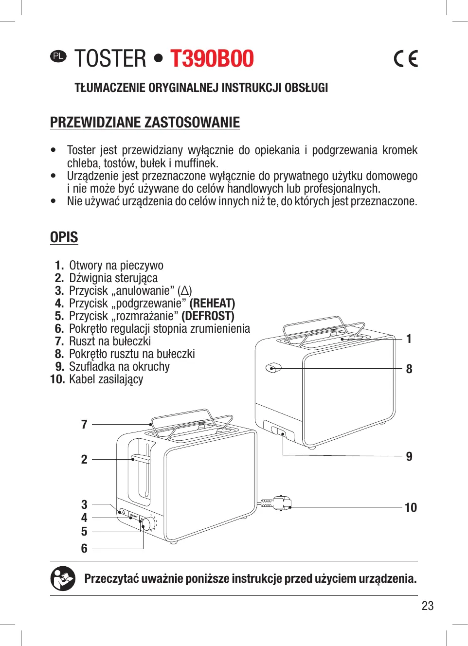 Uwaga: toster umożliwa rozmrażanie i opiekanie pieczywa.