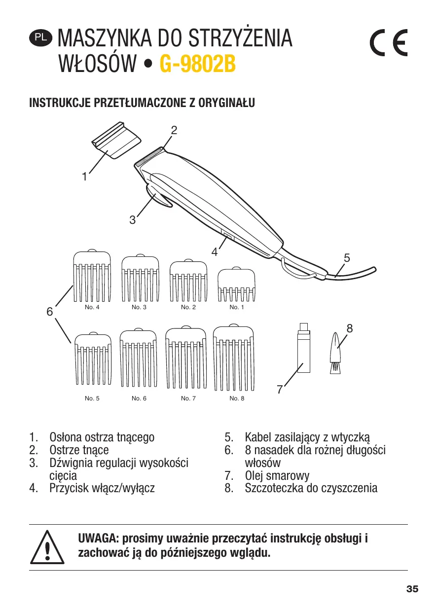 Przed uzyciem maszynki do strzyzenialedge dokladnie przyeczytać niniejsze instrukcje i przechować je w bezpiecznym.),