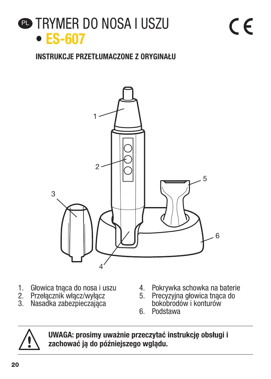 Przedstawione poniżej informacje dotyczą zdrowia i bezpieczeństwa użytkownika. Należy zapoznać się z tymi zaleceniami przed przystąpieniem do użycia produktu. Trymer jest przeznaczony wyłącznie do użytku domowego. Warunki gwarancji ulegają zmianie w przypadku użycia komercyjnego. Urządzenie jest przeznaczone wyłącznie do przycinania włosów ludzkich. Nie używać urządzenia do przycinania sztucznych włosów lub strzyżenia sierści zwierząt. Każde użycie niezgodne z określonymi zastosowaniami spowoduje anulowanie gwarancji. Trymer jest przeznaczony do usuwania włosków z nosa i uszu oraz do przycinania bokobrodów i regulowania konturów w okolicach karku. Nie używać urządzenia w okolicach oczu oraz do cięcia długich włosów. Nie używać urządzenia podczas brania kąpieli lub prysznica. Nie zanurzać urządzenia w wodzie lub innej cieczy. W czasie korzystanie z trymera nie kłaść go na mokrych powierzchniach lub ubraniu. Nie odkładać ani nie przechowywać urządzenia w miejscu, w którym może spaść do wody. Nie używać urządzenia w przypadku uszkodzenia głowicy trymera. Ryzyko obrażeń ciała. Nigdy nie starać się usuwać włosów lub ciał obcych ze środka trymera przy użyciu ostrych przedmiotów. Oczyścić trymer po każdym użyciu. Urządzenie może być używane przez dzieci od 8 roku życia oraz osoby, których zdolności fizyczne, sensoryczne lub umysłowe są ograniczone, a także przez osoby nieposiadające doświadczenia lub znajomości urządzenia, jeśli są właściwie nadzorowane lub uzyskały wskazówki dotyczące bezpiecznej obsługi urządzenia i zrozumiały związane z nim zagrożenia. Nie zezwalać dzieciom na zabawę urządzeniem. Czyszczenie i czynności konserwacyjne należące do użytkownika nie powinny być wykonywane przez dzieci bez nadzoru. Nie wsuwać trymera do uszu lub nosa na głębokość większą niż 0,5 mm, aby uniknąć uszkodzenia błony bębenkowej lub błony śluzowej nosa.