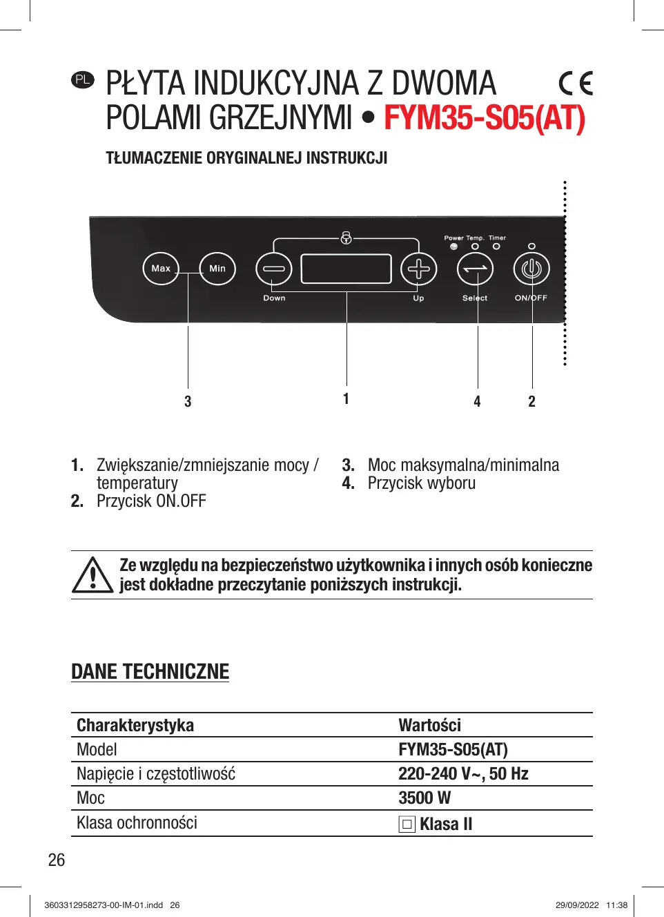 Ze względu na bezpieczeństwo użytkownika i innych osób konieczne jest dokładne przeczytanie poniższych instrukcji. DANE TECHNICZNE Charakterystyka Model Napięcie i częstotliwość Moc Klasa ochronności Wartości FYM35-S05(AT) 220-240 V~, 50 Hz 3500 W Klasa II