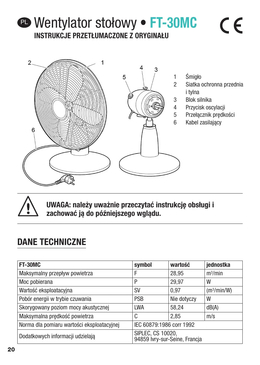 Upewnic sie, ze wentylator jest umieszczony w stabilnym mistrscu. - Urzadzenie jest przyznaczone wyłącznie do uzytku domowego. Poza czyszczeniem i bieść konserwacja wykonywaną przyze uzytkownika innec czynnosci konserwacyjne powinny być przypegowadzane przyez wykwalifikowanego elektryka.