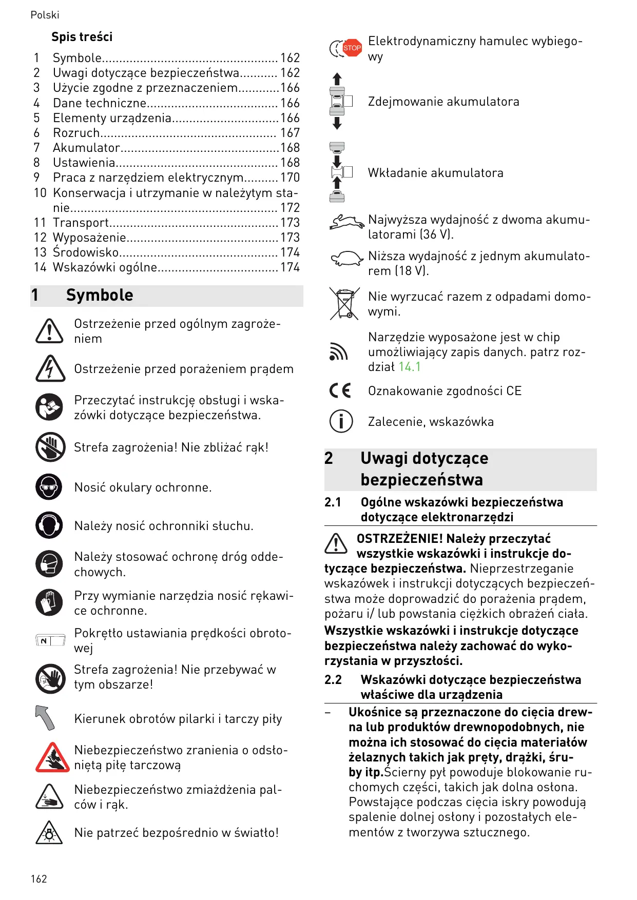 Remplacez les butées détériorées par la lame de scie ou endommagées. Les bu tées endommagées risquent d'être proje tées lors de l'utilisation de la scie. Les personnes situées à proximité peuvent être blessées. Ne jamais mettre la main dans l'ouverture d'éjection des copeaux. Les pièces en rota tion peuvent entraîner des blessures des mains. Pendant l'utilisation, des poussières dan gereuses pour la santé peuvent être dé gagées (par ex. dans le cas des revête ments au plomb ou de certaines essences de bois). Le contact ou l'inhalation de ces poussières peut présenter un danger pour la santé de l'utilisateur ou des personnes se trouvant à proximité. Veuillez respecter les prescriptions de sécurité en vigueur dans votre pays. Pour protéger votre santé, portez une protection respiratoire appropriée. Dans les espaces clos, assurer une ventilation suffisante et raccorder un aspirateur. Utiliser l'outil électroportatif uniquement à l'intérieur et dans un environnement sec. Pour faire fonctionner l'outil électroporta tif sans fil, servez-vous uniquement des batteries prévues à cette fin et n'utilisez jamais de blocs d'alimentation. N'utilisez pas de chargeurs d'autres fabricants pour recharger les batteries. L'utilisation d'ac cessoires autres que ceux prévus par le fa bricant peut provoquer une décharge élec trique et/ou des accidents graves. Vérifiez si des éléments du carter pré sentent des dommages (fissures, fendille ments, etc.). Faites réparer les parties en dommagées avant d'utiliser l'outil électro portatif. Ne vous placez jamais sur la table de scia ge et ne l'utilisez pas comme marchepied. La table de sciage et les roulettes pivotan tes ou les pieds additionnels disponibles en option pourraient se tordre. Ceci augmen terait le risque de recul dangereux.