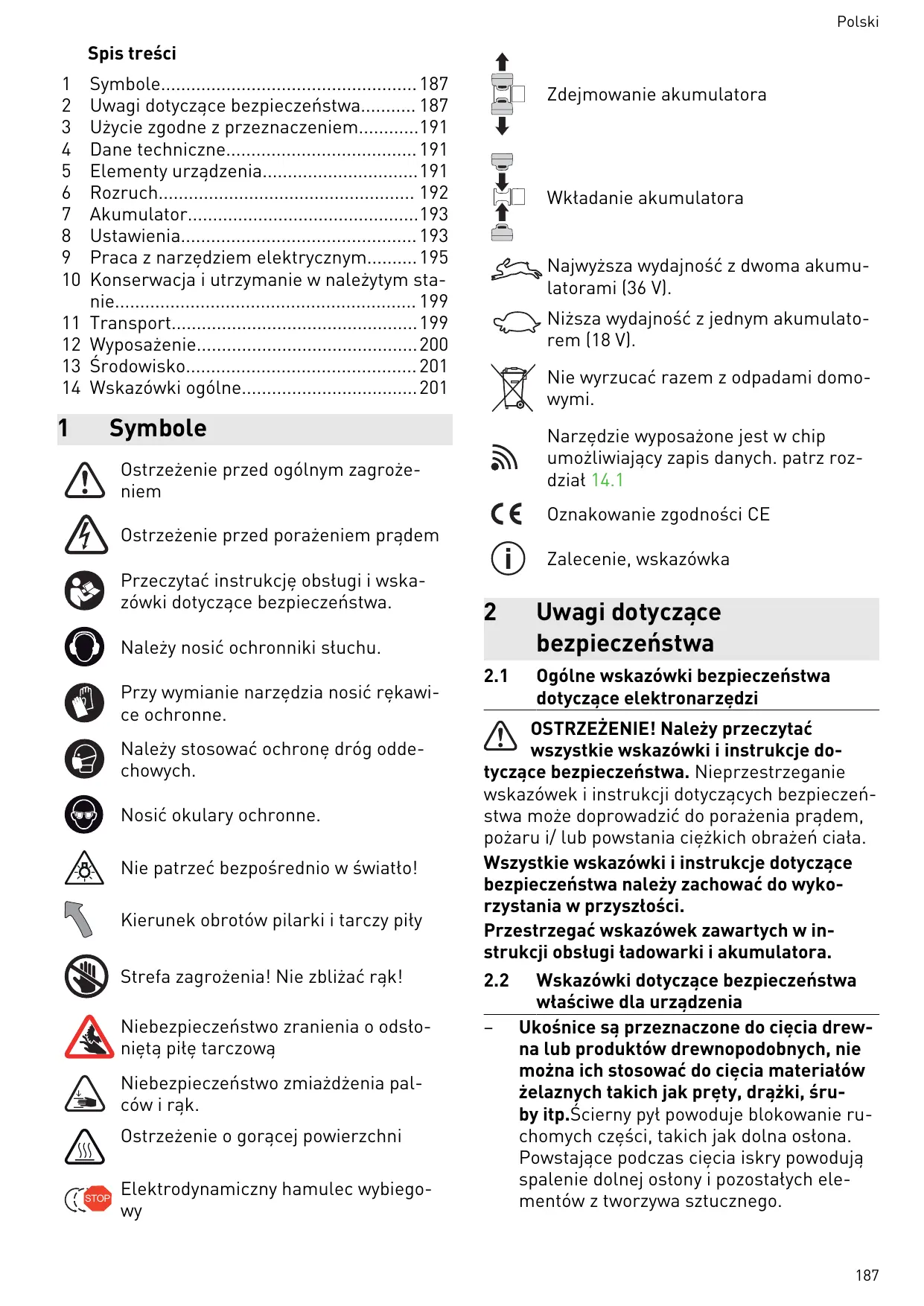 Ler Manual de instruções, indicações de segurança. Usar proteção auditiva. Usar luvas de proteção durante a mu dança da ferramenta. Usar máscara de proteção respirató ria. Usar óculos de proteção. Não olhar diretamente para a luz! Sentido de rotação da serra e da lâmi na de serra Zona de perigo! Manter as mãos afas tadas! Perigo de corte na lâmina de serra sem proteção Perigo de esmagamento dos dedos e das mãos. Advertência de superfície quente