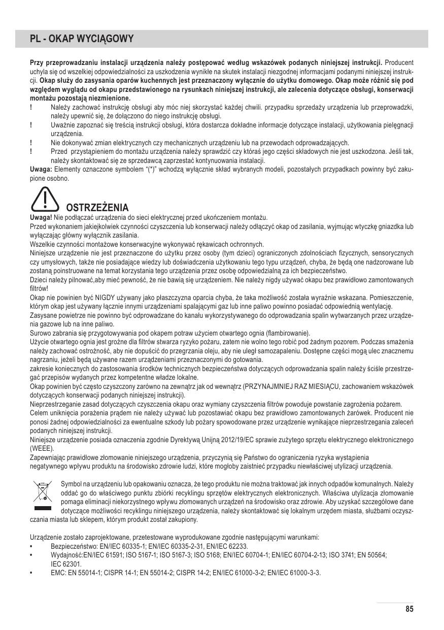 OSTRZEŻENIA Uwaga! Nie podłączać urządzenia do sieci elektrycznej przed ukończeniem montażu. Przed wykonaniem jakiejkolwiek czynności czyszczenia lub konserwacji należy odłączyć okap od zasilania, wyjmując wtyczkę gniazdka lub wyłączając główny wyłącznik zasilania. Wszelkie czynności montażowe konserwacyjne wykonywać rękawicach ochronnych. Niniejsze urządzenie nie jest przeznaczone do użytku przez osoby (tym dzieci) ograniczonych zdolnościach fizycznych, sensorycznych czy umysłowych, także nie posiadające wiedzy lub doświadczenia użytkowaniu tego typu urządzeń, chyba, że będą one nadzorowane lub zostaną poinstruowane na temat korzystania tego urządzenia przez osobę odpowiedzialną za ich bezpieczeństwo. Dzieci należy pilnować,aby mieć pewność, że nie bawią się urządzeniem. Nie należy nigdy używać okapu bez prawidłowo zamontowanych filtrów! Okap nie powinien być NIGDY używany jako płaszczyzna oparcia chyba, że taka możliwość została wyraźnie wskazana. Pomieszczenie, którym okap jest używany łącznie innymi urządzeniami spalającymi gaz lub inne paliwo powinno posiadać odpowiednią wentylację. Zasysane powietrze nie powinno być odprowadzane do kanału wykorzystywanego do odprowadzania spalin wytwarzanych przez urządzenia gazowe lub na inne paliwo. Surowo zabrania się przygotowywania pod okapem potraw użyciem otwartego ognia (flambirowanie). Użycie otwartego ognia jest groźne dla filtrów stwarza ryzyko pożaru, zatem nie wolno tego robić pod żadnym pozorem. Podczas smażenia należy zachować ostrożność, aby nie dopuścić do przegrzania oleju, aby nie uległ samozapaleniu. Dostępne części mogą ulec znacznemu nagrzaniu, jeżeli będą używane razem urządzeniami przeznaczonymi do gotowania. zakresie koniecznych do zastosowania środków technicznych bezpieczeństwa dotyczących odprowadzania spalin należy ściśle przestrzegać przepisów wydanych przez kompetentne władze lokalne. Okap powinien być często czyszczony zarówno na zewnątrz jak od wewnątrz (PRZYNAJMNIEJ RAZ MIESIĄCU, zachowaniem wskazówek dotyczących konserwacji podanych niniejszej instrukcji). Nieprzestrzeganie zasad dotyczących czyszczenia okapu oraz wymiany czyszczenia filtrów powoduje powstanie zagrożenia pożarem. Celem uniknięcia porażenia prądem nie należy używać lub pozostawiać okapu bez prawidłowo zamontowanych żarówek. Producent nie ponosi żadnej odpowiedzialności za ewentualne szkody lub pożary spowodowane przez urządzenie wynikające nieprzestrzegania zaleceń podanych niniejszej instrukcji. Niniejsze urządzenie posiada oznaczenia zgodnie Dyrektywą Unijną 2012/19/EC sprawie zużytego sprzętu elektrycznego elektronicznego (WEEE). Zapewniając prawidłowe złomowanie niniejszego urządzenia, przyczynią się Państwo do ograniczenia ryzyka wystąpienia negatywnego wpływu produktu na środowisko zdrowie ludzi, które mogłoby zaistnieć przypadku niewłaściwej utylizacji urządzenia. Symbol na urządzeniu lub opakowaniu oznacza, że tego produktu nie można traktować jak innych odpadów komunalnych. Należy oddać go do właściwego punktu zbiórki recyklingu sprzętów elektrycznych elektronicznych. Właściwa utylizacja złomowanie pomaga eliminacji niekorzystnego wpływu złomowanych urządzeń na środowisko oraz zdrowie. Aby uzyskać szczegółowe dane dotyczące możliwości recyklingu niniejszego urządzenia, należy skontaktować się lokalnym urzędem miasta, służbami oczyszczania miasta lub sklepem, którym produkt został zakupiony. Urządzenie zostało zaprojektowane, przetestowane wyprodukowane zgodnie następującymi warunkami: •• Bezpieczeństwo: EN/IEC 60335-1; EN/IEC 60335-2-31, EN/IEC 62233. •• Wydajność:EN/IEC 61591; ISO 5167-1; ISO 5167-3; ISO 5168; EN/IEC 60704-1; EN/IEC 60704-2-13; ISO 3741; EN 50564; IEC 62301. •• EMC: EN 55014-1; CISPR 14-1; EN 55014-2; CISPR 14-2; EN/IEC 61000-3-2; EN/IEC 61000-3-3.