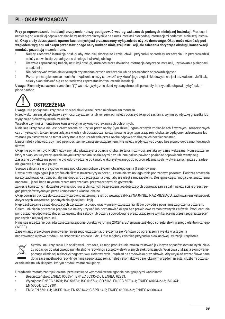 OSTRZEŻENIA Uwaga! Nie podłączać urządzenia do sieci elektrycznej przed ukończeniem montażu. Przed wykonaniem jakiejkolwiek czynności czyszczenia lub konserwacji należy odłączyć okap od zasilania, wyjmując wtyczkę gniazdka lub wyłączając główny wyłącznik zasilania. Wszelkie czynności montażowe konserwacyjne wykonywać rękawicach ochronnych. Niniejsze urządzenie nie jest przeznaczone do użytku przez osoby (tym dzieci) ograniczonych zdolnościach fizycznych, sensorycznych czy umysłowych, także nie posiadające wiedzy lub doświadczenia użytkowaniu tego typu urządzeń, chyba, że będą one nadzorowane lub zostaną poinstruowane na temat korzystania tego urządzenia przez osobę odpowiedzialną za ich bezpieczeństwo. Dzieci należy pilnować, aby mieć pewność, że nie bawią się urządzeniem. Nie należy nigdy używać okapu bez prawidłowo zamontowanych filtrów! Okap nie powinien być NIGDY używany jako płaszczyzna oparcia chyba, że taka możliwość została wyraźnie wskazana. Pomieszczenie, którym okap jest używany łącznie innymi urządzeniami spalającymi gaz lub inne paliwo powinno posiadać odpowiednią wentylację. Zasysane powietrze nie powinno być odprowadzane do kanału wykorzystywanego do odprowadzania spalin wytwarzanych przez urządzenia gazowe lub na inne paliwo. Surowo zabrania się przygotowywania pod okapem potraw użyciem otwartego ognia (flambirowanie). Użycie otwartego ognia jest groźne dla filtrów stwarza ryzyko pożaru, zatem nie wolno tego robić pod żadnym pozorem. Podczas smażenia należy zachować ostrożność, aby nie dopuścić do przegrzania oleju, aby nie uległ samozapaleniu. Dostępne części mogą ulec znacznemu nagrzaniu, jeżeli będą używane razem urządzeniami przeznaczonymi do gotowania. zakresie koniecznych do zastosowania środków technicznych bezpieczeństwa dotyczących odprowadzania spalin należy ściśle przestrzegać przepisów wydanych przez kompetentne władze lokalne. Okap powinien być często czyszczony zarówno na zewnątrz jak od wewnątrz (PRZYNAJMNIEJ RAZ MIESIĄCU, zachowaniem wskazówek dotyczących konserwacji podanych niniejszej instrukcji). Nieprzestrzeganie zasad dotyczących czyszczenia okapu oraz wymiany czyszczenia filtrów powoduje powstanie zagrożenia pożarem. Celem uniknięcia porażenia prądem nie należy używać lub pozostawiać okapu bez prawidłowo zamontowanych żarówek. Producent nie ponosi żadnej odpowiedzialności za ewentualne szkody lub pożary spowodowane przez urządzenie wynikające nieprzestrzegania zaleceń podanych niniejszej instrukcji. Niniejsze urządzenie posiada oznaczenia zgodnie Dyrektywą Unijną 2012/19/EC sprawie zużytego sprzętu elektrycznego elektronicznego (WEEE). Zapewniając prawidłowe złomowanie niniejszego urządzenia, przyczynią się Państwo do ograniczenia ryzyka wystąpienia negatywnego wpływu produktu na środowisko zdrowie ludzi, które mogłoby zaistnieć przypadku niewłaściwej utylizacji urządzenia. Symbol na urządzeniu lub opakowaniu oznacza, że tego produktu nie można traktować jak innych odpadów komunalnych. Należy oddać go do właściwego punktu zbiórki recyklingu sprzętów elektrycznych elektronicznych. Właściwa utylizacja złomowanie pomaga eliminacji niekorzystnego wpływu złomowanych urządzeń na środowisko oraz zdrowie. Aby uzyskać szczegółowe dane dotyczące możliwości recyklingu niniejszego urządzenia, należy skontaktować się lokalnym urzędem miasta, służbami oczyszczania miasta lub sklepem, którym produkt został zakupiony. Urządzenie zostało zaprojektowane, przetestowane wyprodukowane zgodnie następującymi warunkami: • Bezpieczeństwo: EN/IEC 60335-1; EN/IEC 60335-2-31, EN/IEC 62233. • Wydajność:EN/IEC 61591; ISO 5167-1; ISO 5167-3; ISO 5168; EN/IEC 60704-1; EN/IEC 60704-2-13; ISO 3741; EN 50564; IEC 62301. • EMC: EN 55014-1; CISPR 14-1; EN 55014-2; CISPR 14-2; EN/IEC 61000-3-2; EN/IEC 61000-3-3.