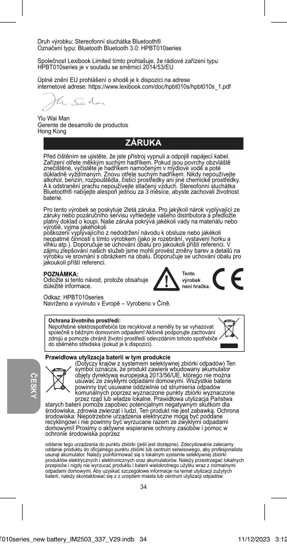 Stitch HPBT010series - Słuchawki Bluetooth LEXIBOOK - Bezpłatna instrukcja obsługi