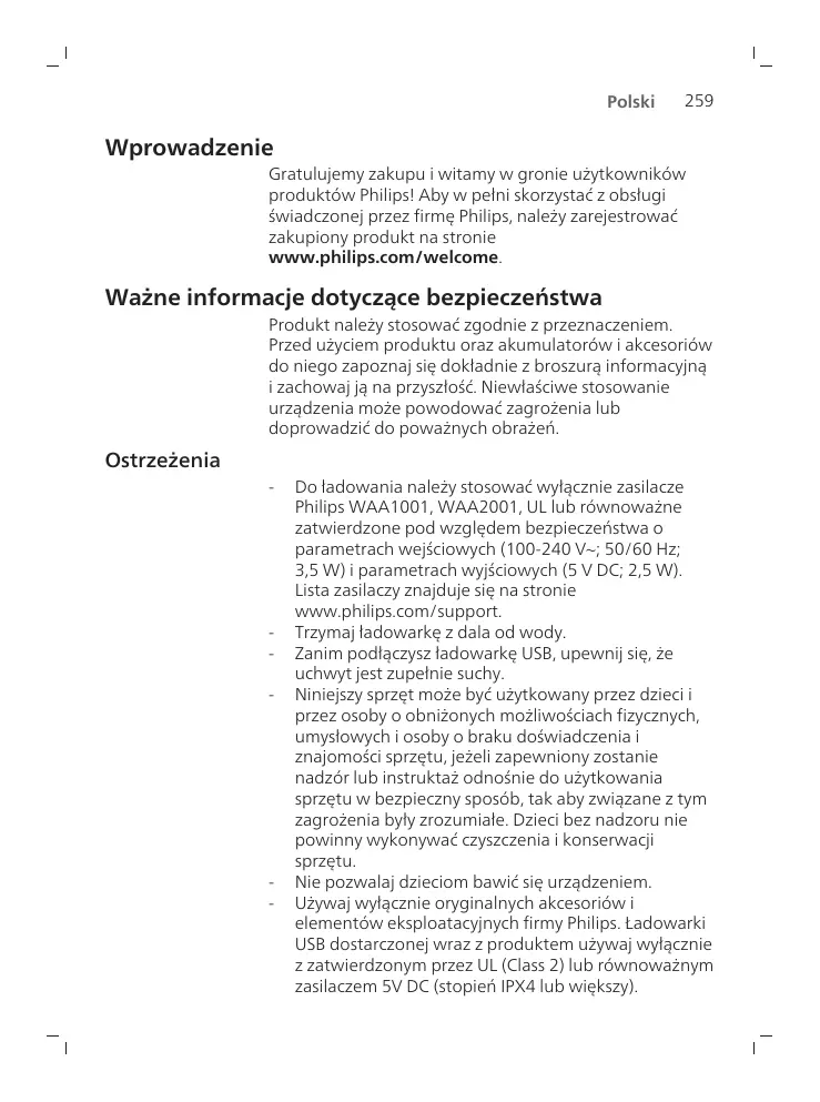 - Utilisez exclusivement des accessoires ou des consommables de la marque Philips. Utilisez uniquement le chargeur USB fourni avec le produit avec un adaptateur SV CC (IPX4 ou supérieur) homologué UL (classe 2) ou équivalent.