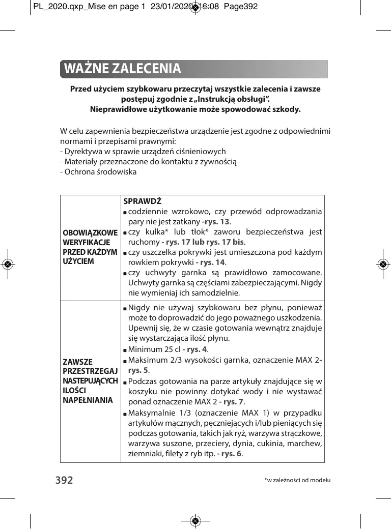 « Maximum 1/3 (repère MAX 1) pour les aliments pâteux qui se dilatent et/ou qui moussent pendant la cuisson, comme le riz, les légumineuses, les légumes déshydratés, les compotes, le potiron, les courgettes, les carottes, les pommes de terre, les filets de poisson... fig 6.