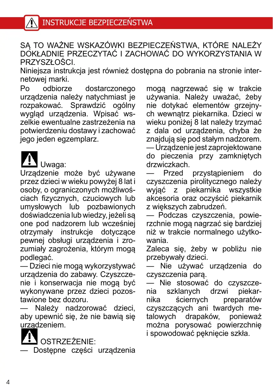 — Przed przystapieniem do czyszczenia pirolitycznego nalezy wyjaé z piekarnika wszystkie akcesoria oraz oczy$cié piekarnik z Wiekszych zabrudzeñ.