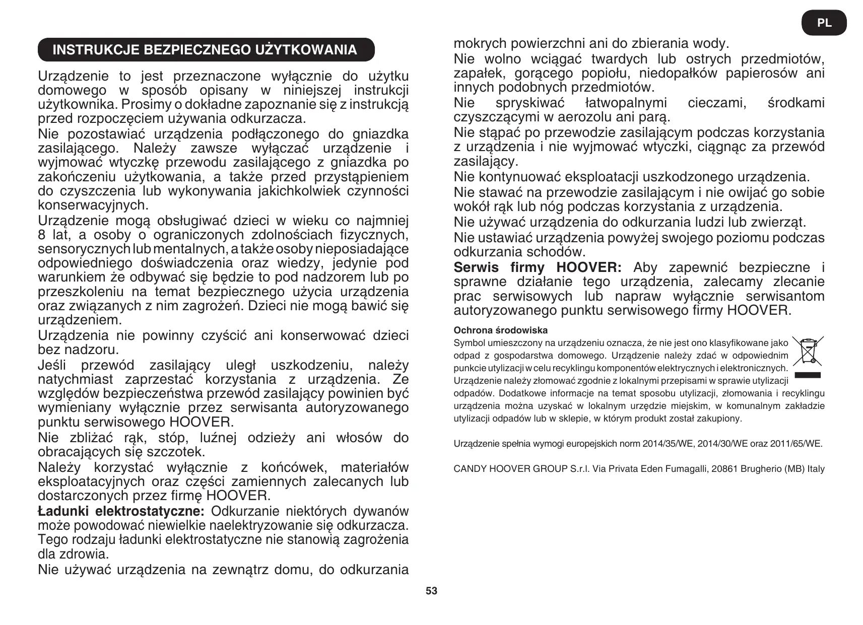 INSTRUKCJA OBSŁUGI HP710PAR HOOVER