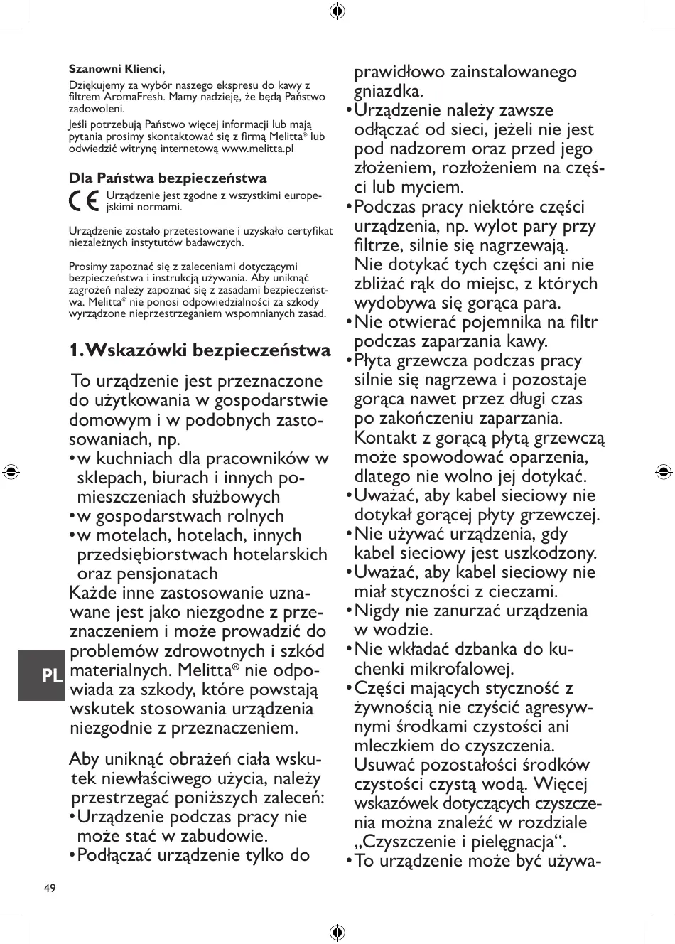 Prosimy zapoznaé sie z zaleceniami dotyczacymi bezpieczeñstwa i instrukcja uzywania. Aby uniknaé zagroieh naley zapoznaé sie z zasadami bezpieczenst- wa. Melitta® nie ponosi odpowiedzialnoéci za szkody wyrzadzone nieprzestrzeganiem wspomnianych zasad