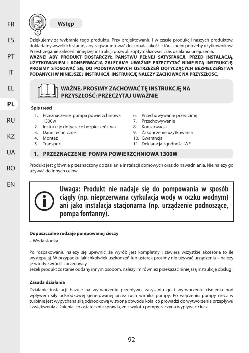 : PRZECZYTAJ UWAZNIE Spis treéci 1. Przeznaczenie pompa powierzchniowa 6. Przechowywanie przez zime 1300w 7. Przechowywanie 2... Instrukcje dotyczace bezpieczeristwa 8. Konserwacja 3. Dane techniczne 9. Zakorczenie uzytkowania 4. Montai 10. Gwarancja 5. Transport 11. Deklaracja zgodnoéci WE