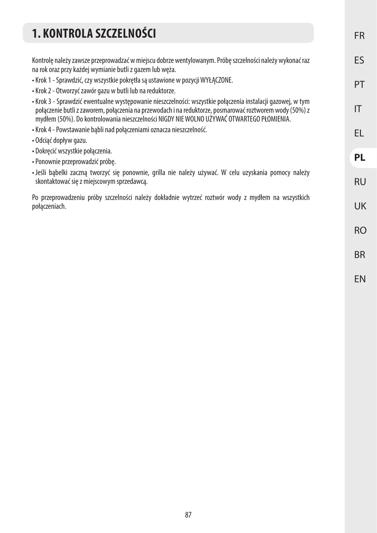- Faîtes le test d'étanchéité chaque année et à chaque remplacement ou retrait de la bouteille de gaz et du flexible.