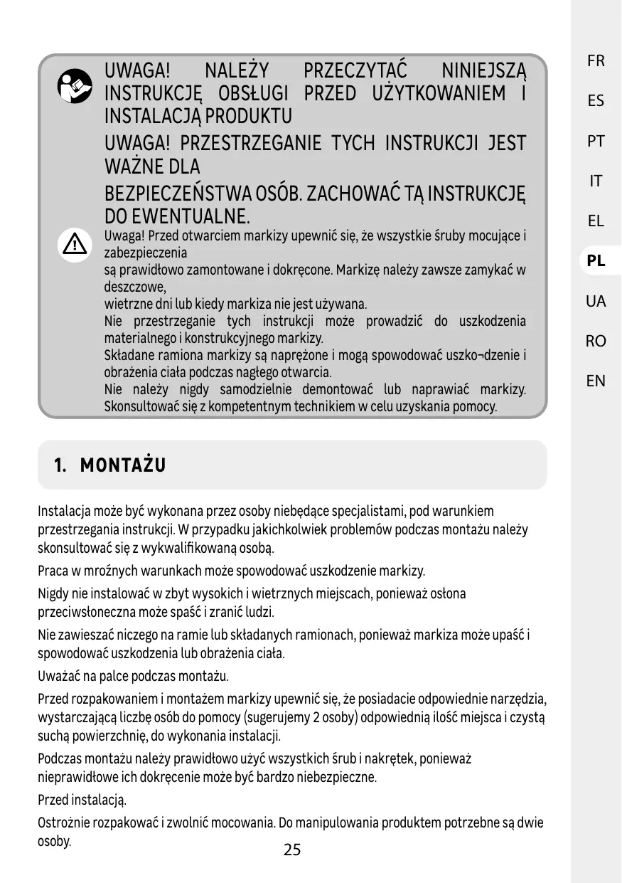 VAN Avant d'ouvrir Le store banne vous devez être sûr que les fixations et les éléments de sécurité ont été installés de façon correcte. Vous devez toujours fermer votre store banne quand Le vent souffle, durant une averse et quand vous n’en avez pas l'usage. Ne pas respecter ces consignes pourrait provoquer des dommages matériels et structurels. Les bras du store banne sont tendus et peuvent provoquer en cas d'ouverture brutale, des blessures et des dommages. Ne jamais essayer de démonter ou de réparer vous-même ce store banne. Faites appel à un technicien qualifié.