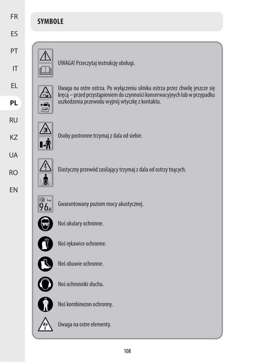+ N'utilisez jamais la tondeuse si l’un de ses boucliers ou capots de protection est défectueux, ou sans lun de ses dispositifs de sécurité