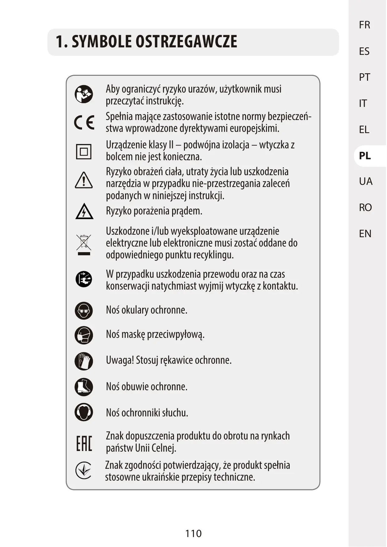 - Utilisez toujours des protections auditives et oculaires. Utilisez des équipements de protection individuelle, par exemple un masque antipoussières, des gants, un casque et un tablier doivent être portés ;